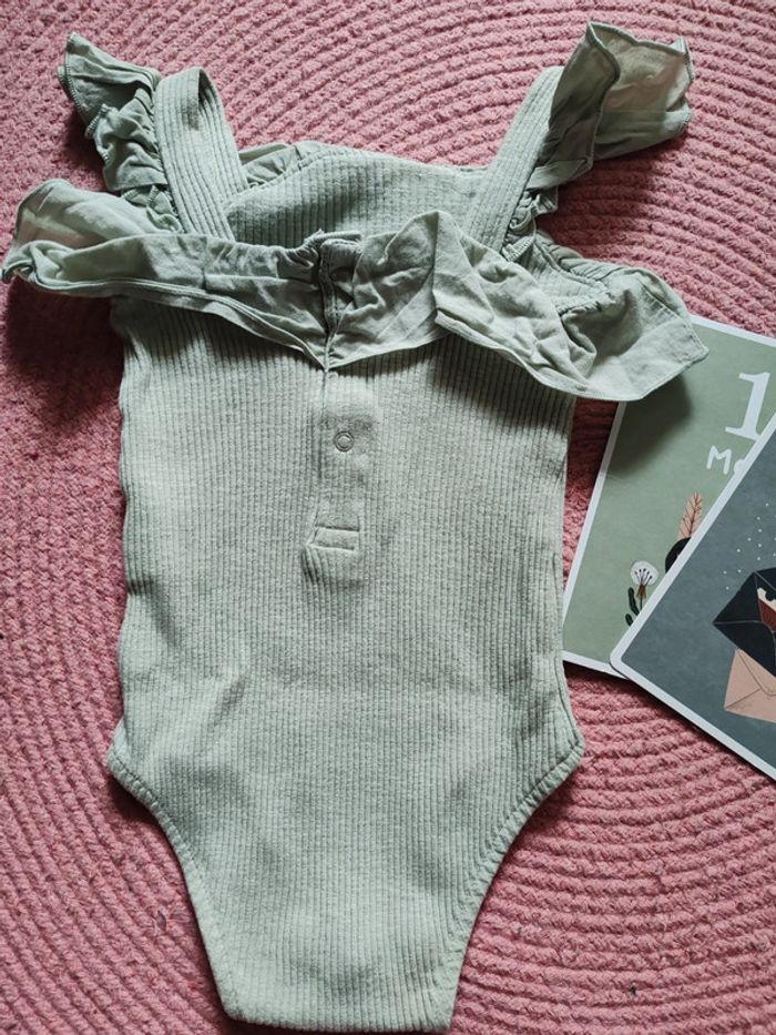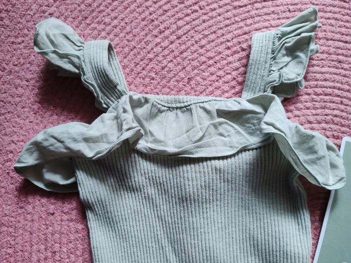 #amaandineeb_bebefille18mois Joli body côtelé vert anis avec volant au niveau du col et des bretelles. Très peu porté. Très bon état. Sans tâches ni trous. Kiabi. 18 mois.