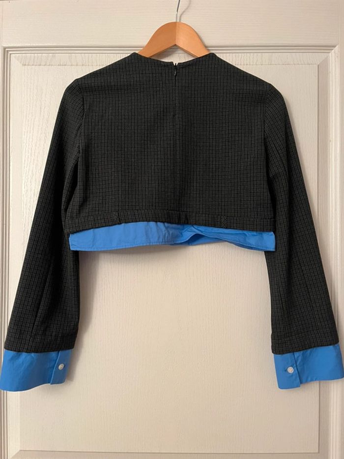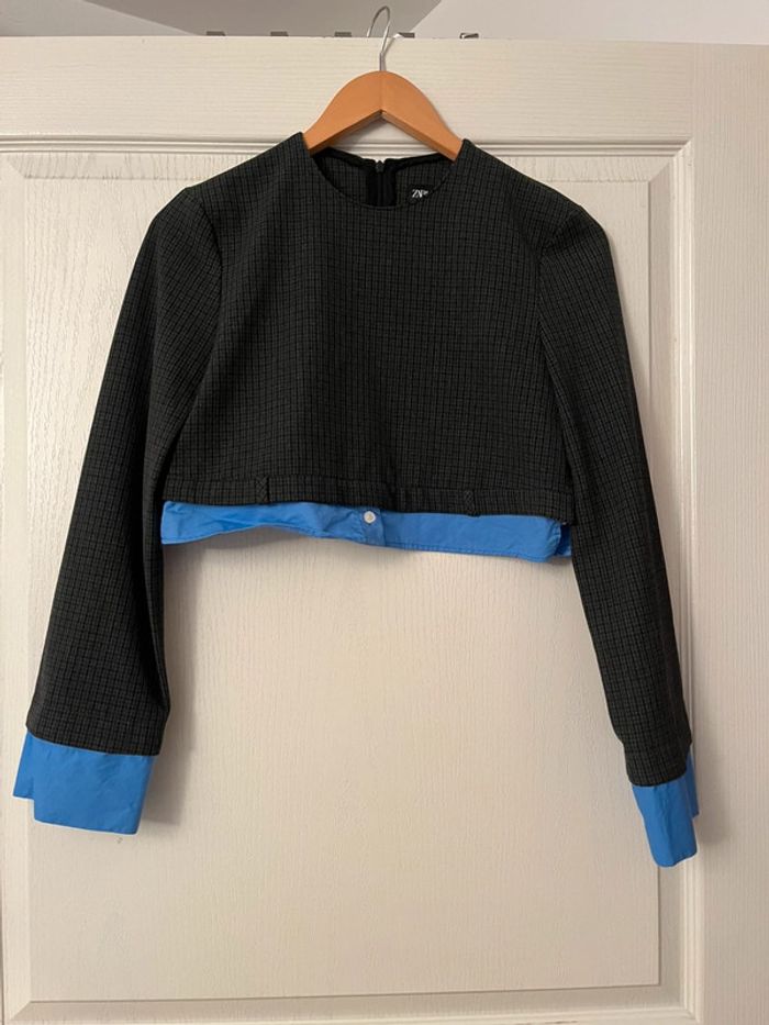 Crop top manche longue gris rayé et noir avec chemise en dessous bleu Marque Zara taille xs