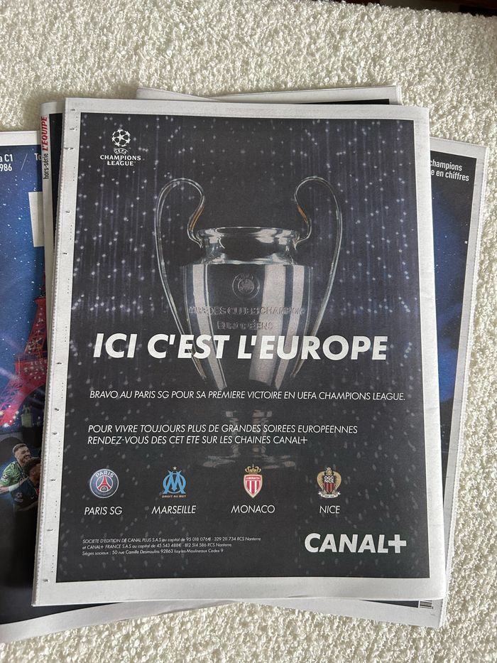 📣 L’Équipe – Hors-Série PSG Vainqueur Ligue des Champions 2025 🗞️ “GRAND D’EUROPE” - Collector historique ! 🔥 Revivez l’épopée légendaire du Paris Saint-Germain, enfin champion d’Europe en 2025, avec ce numéro hors-série de L’Équipe (juin 2025). Un incontournable pour tous les fans du PSG et passionnés de football ! 📸 Contenu exclusif : • Tous les matchs de la saison 2024-2025 • Les images de la fête • Les chiffres des champions • Et un récit complet de cette conquête historique 🖼️ Parfait pour encadrer ou offrir : un objet collector à exposer fièrement ! ⸻ 📦 Disponibles : • 1 exemplaire à l’unité : 16,99 € • Pack de 4 exemplaires neufs : 50 € (12,50 €/unité) 🆕 État : Neuf, jamais ouvert 🚚 Envoi rapide et soigné 🤝 Disponible pour une remise en main propre ⸻ ⚽ Tu supportes Paris ? Alors ce collector est fait pour toi. N’hésite pas à m’écrire si tu as des questions ou pour convenir d’un point de rendez-vous 🙌