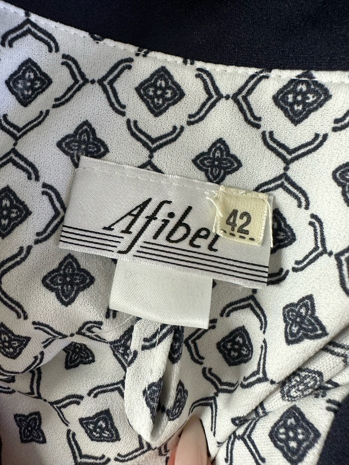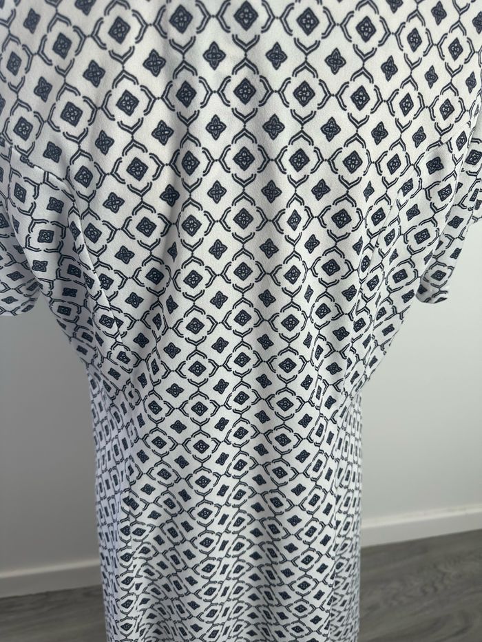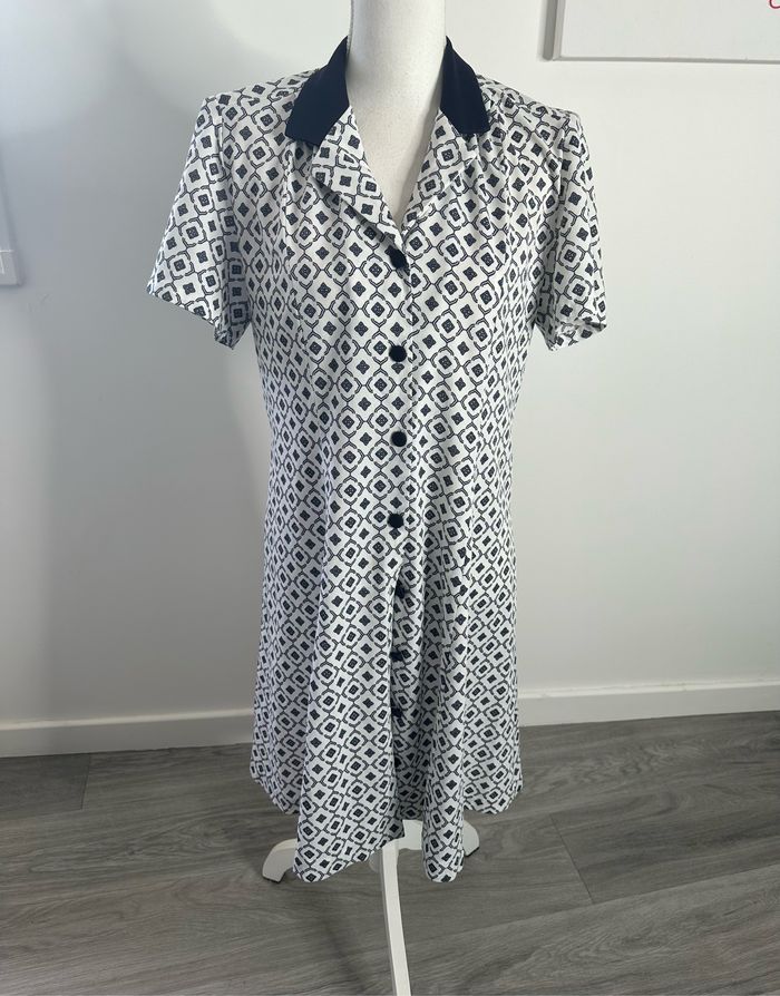 Robe - Excellent état - Taille 42 équivalent XL Dimensions en bas de l’annonce - Bleue marine et blanche - Se ferme avec des boutons - Style rétro pin-up - Tissus bariolé géométrique - Vintage, années 80’ - Pas d’étiquette de matière Dimensions: - 50cm niveau aisselles - 97cm de long