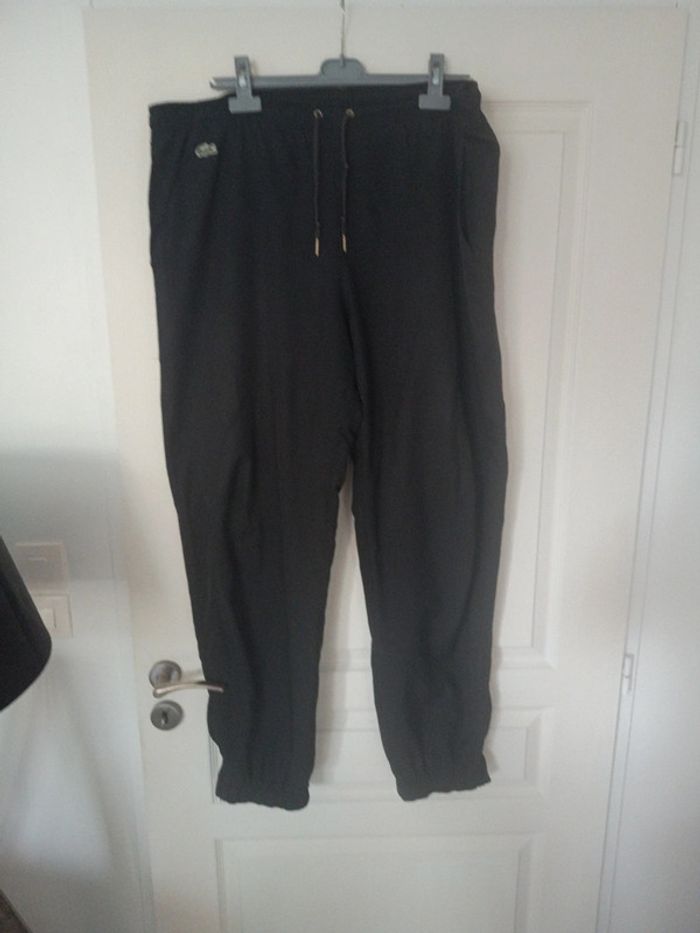 Jogging noir taille xl attention l'élastique ne tient plus Il faut utiliser le lacet de serrage uniquement. Longueur 109 cm taille 53 cm élastique déplié au maximum.