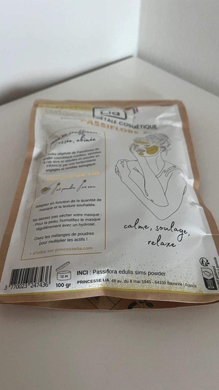 Poudre de Passiflore Princesse Lia Neuve jamais ouverte J'utilise pas ce type de produit La poudre de Passiflore apaise, calme et soulage les peaux agressées et abîmées. Utilisée en masque, votre visage retrouve douceur et votre peau est resplendissante. Cette poudre est extraite de passiflore Bio française. Elle est cueillie et laissée sécher à l'air libre avant d'être transformée en poudre. Packaging en kraft recyclable.. Zones d'utilisation: Visage Conseils d'utilisation : Mélanger une dose de poudre pour deux doses d'eau tiède. Sur le visage : appliquer avec les doigts ou à l'aide pinceau. Laisser agir 20 minutes, puis rincer à l’eau tiède. Ne laisser pas votre masque sécher. Pour cela vous pouvez l'humidifier avec une eau florale.. 5€