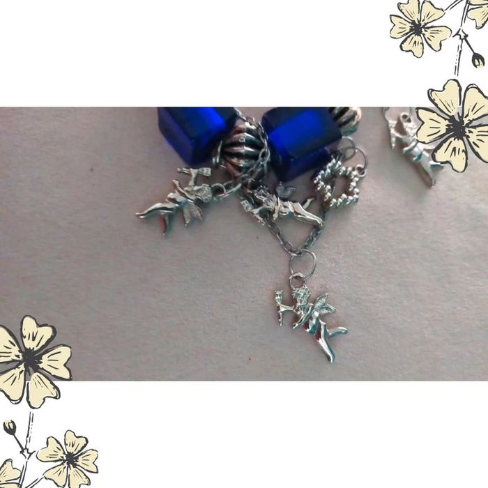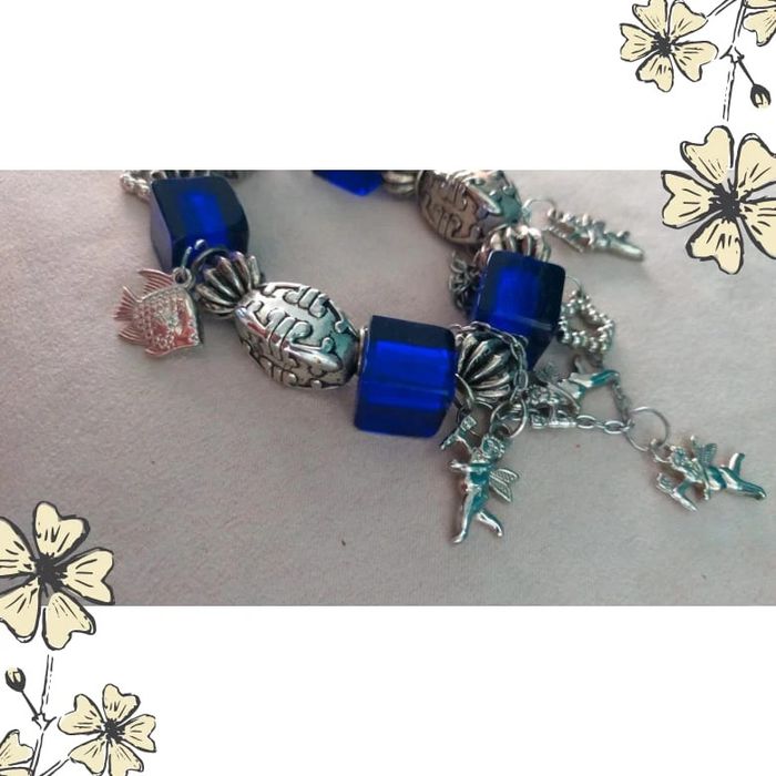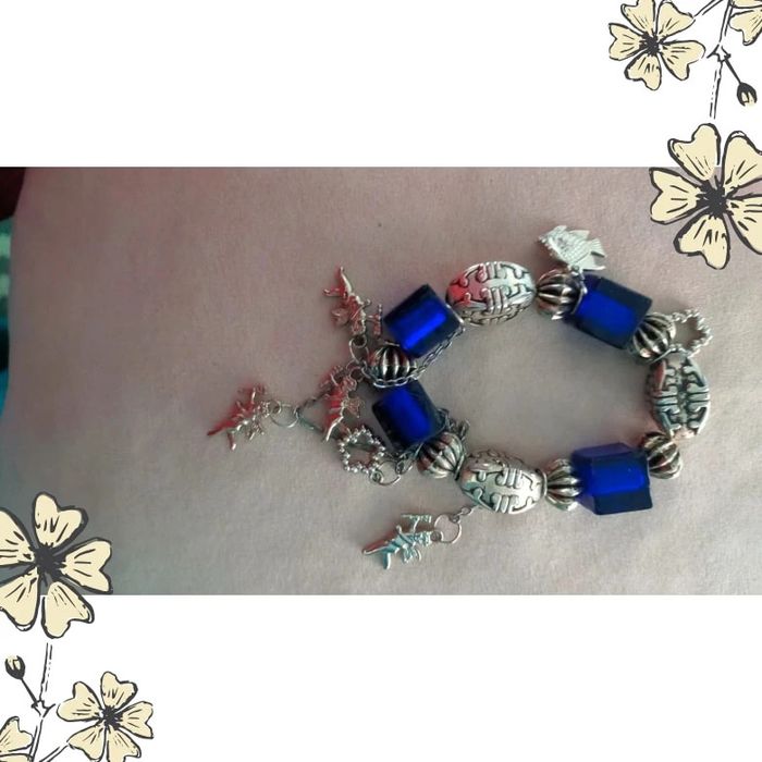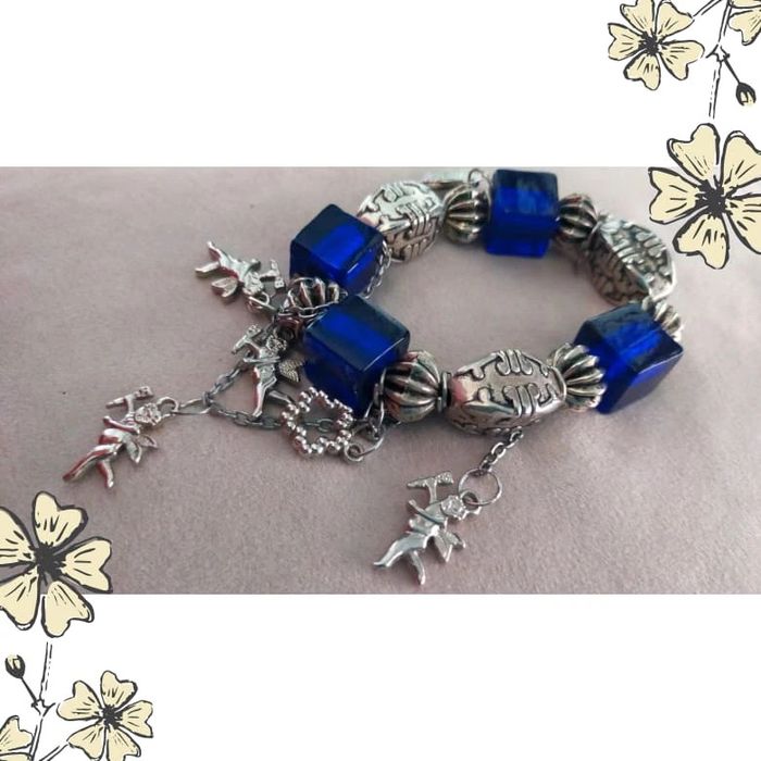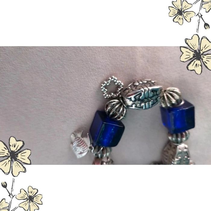 Ce bracelet élastiqué unique marie de gros cubes en verre bleu cobalt à des perles ovales argentées finement travaillées et des breloques fantaisie pleines de caractère (petits poissons, cœurs, anges, etc.). Un bijou chargé de personnalité et d’histoires à imaginer ! Il habillera joliment votre poignet avec une touche bohème chic. Type : Bracelet stretch / élastique Matières : Verre, métal argenté Couleur principale : Bleu profond & argenté Style : Ethnique, bohème, original État : Très bon état Fermoir : Sans fermoir (bracelet élastique) 📏 Taille : convient à la majorité des poignets adultes (élastique) 💡 Idéal pour un look original, ou en accumulation avec d'autres bracelets pour un effet mix & match ! 📦 Envoi rapide & soigné. Possibilité d’envoi en lot ou petit bijou surprise pour les commandes multiples ! L3R #bracelet #braceletethnique #bijouxfantaisie #bleucobalt #bijouoriginal #braceletcharms #boheme #braceletvintage #braceletargenté #bijouaccessoire #bijouxfemme #braceletelastique #brumebleue #joliestrouvailles