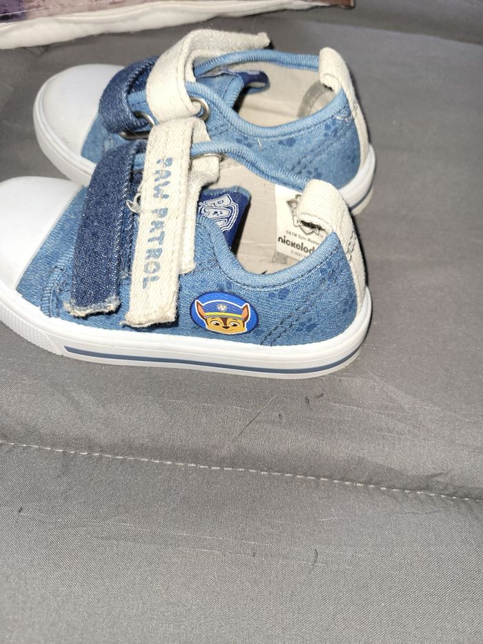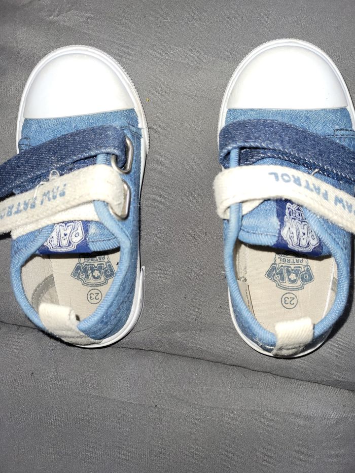 Paire de baskets pointure 23. à scratchs pat patrowl, idéales pour l'école. Coloris blanc et bleu, dessus blanc plastique, bleu en toile avec icône pat Patrouille. Portées mais encore en bon état. Envoi rapide.