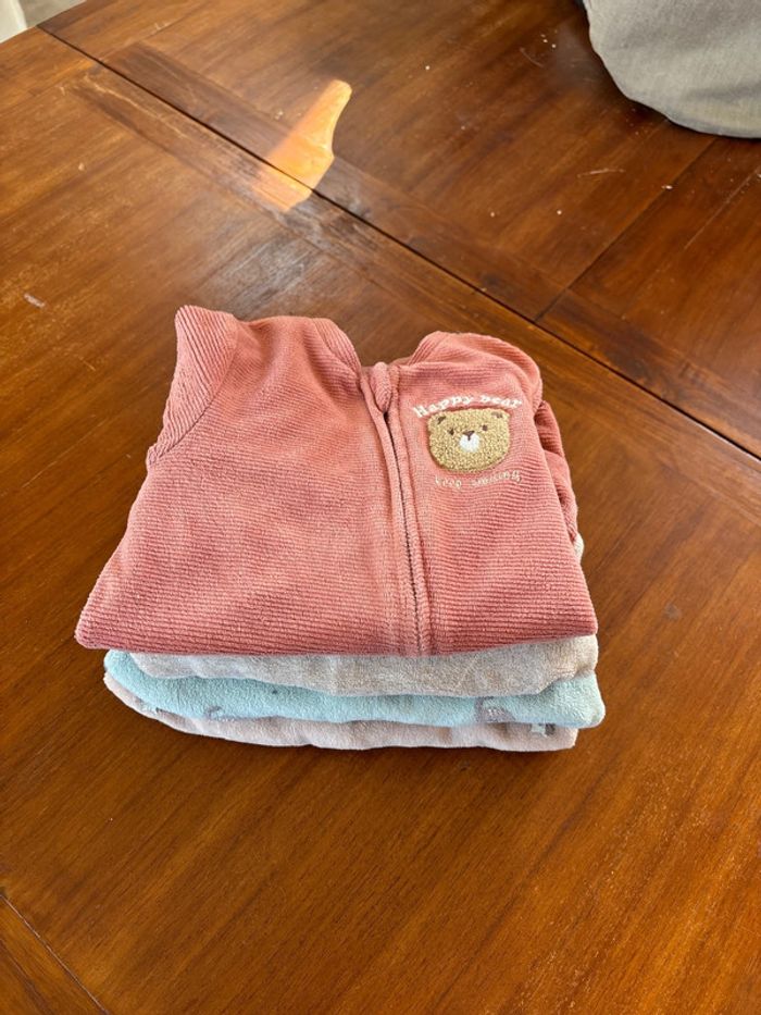 Bonjour je vends un lots de pyjama taille 9 mois de la marque kiabi. Ils sont en bonne état et sans tache 3 qui ce ferment par derrière et 1 par devant