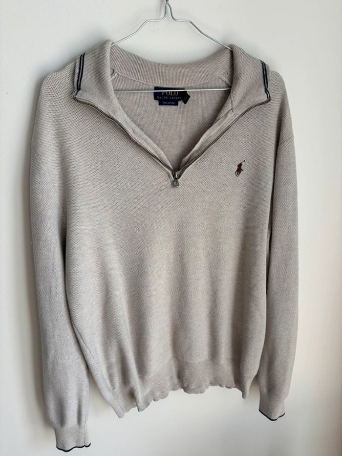 Pull Ralph Lauren En maille beige avec le logo marron Attention petite tache bleue voir dernière photo Envoie rapide