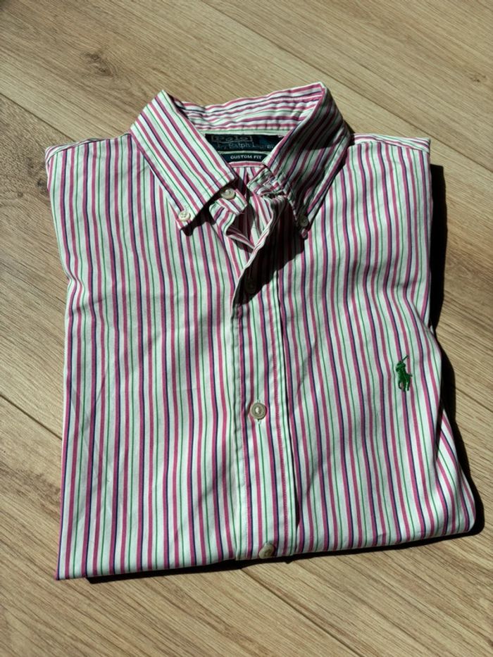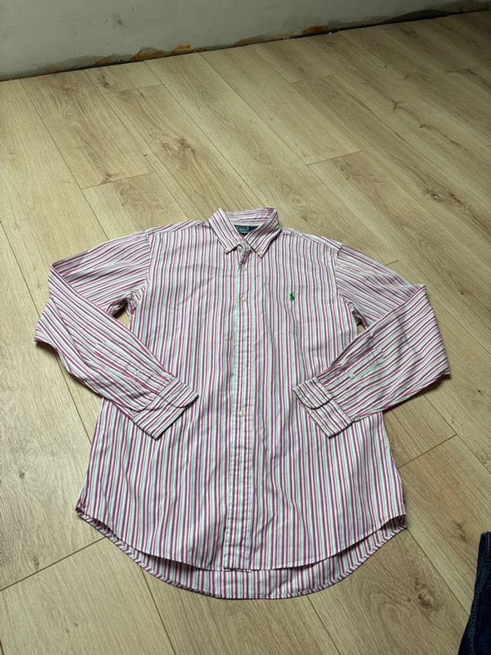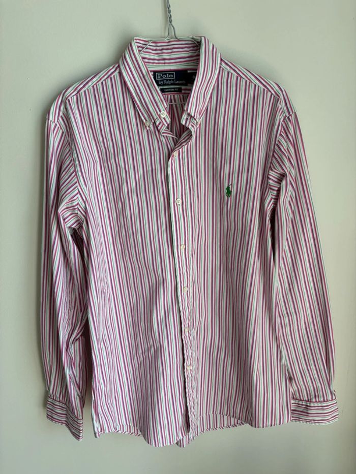 Chemise à manche longue Ralph Lauren rayures rose blanche et verte avec logo vert taille M - photo numéro 1
