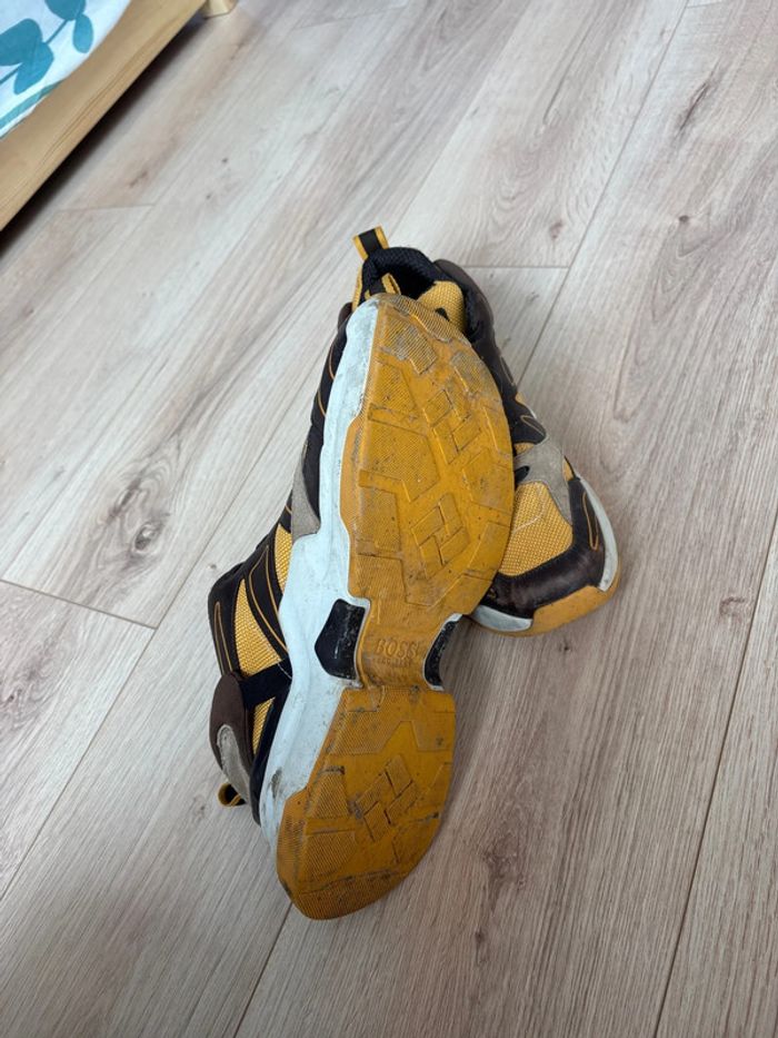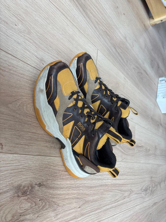 Ici en vente 👟 Une belle paire de baskets Hugo boss taille 43 Très peux porté Couleur moutarde et marron Envoie rapide