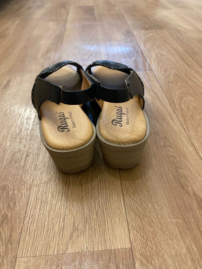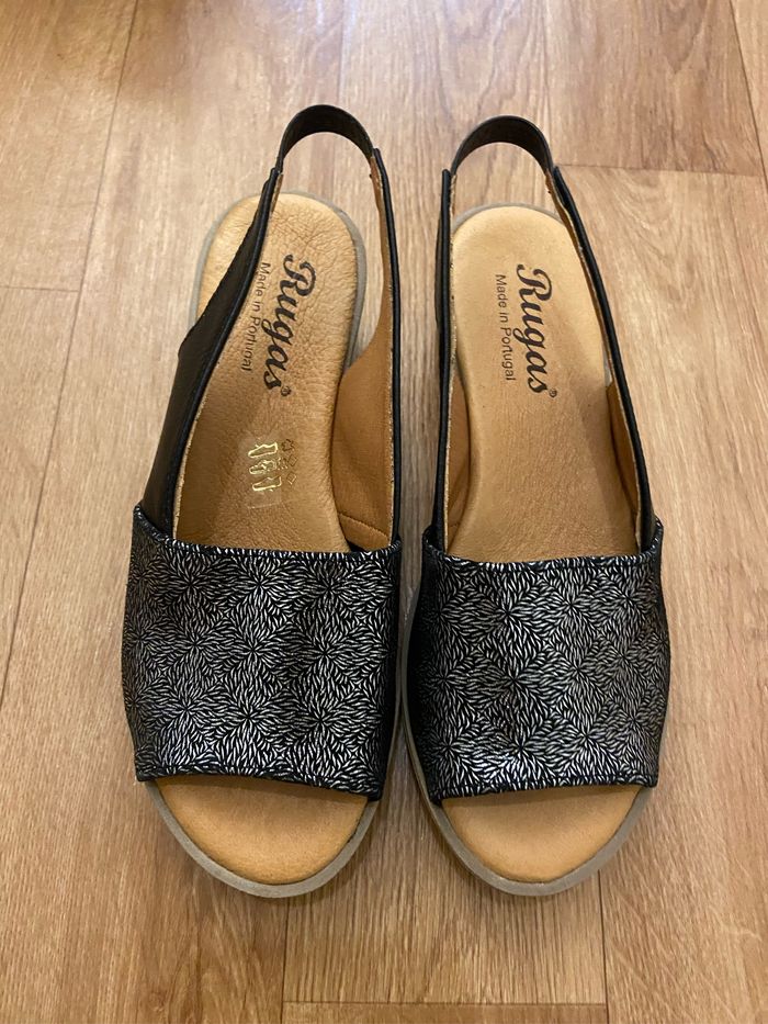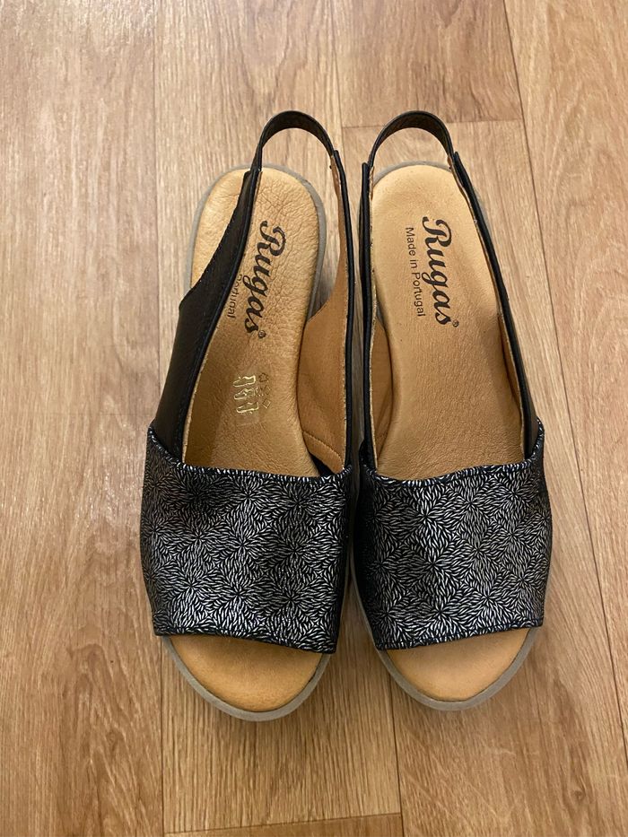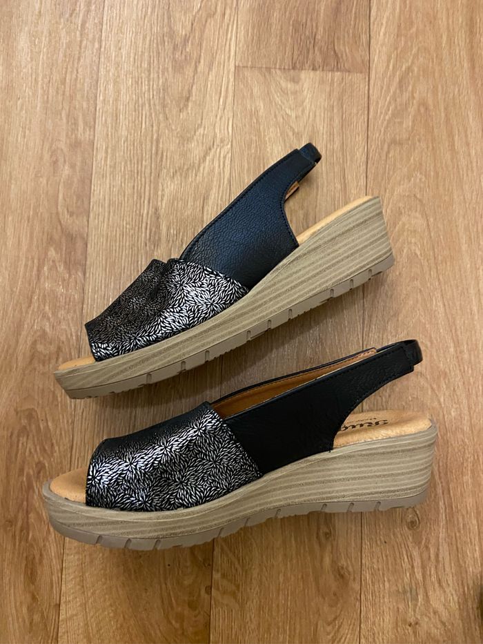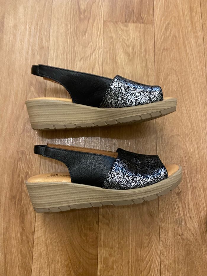 Sandales compensées noires argentées en cuir 38 Neuves jamais portées Hauteur talon 5 cm