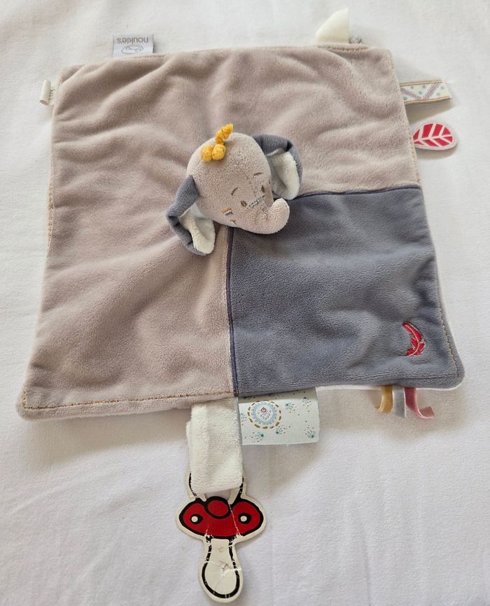 Doudou carré plat en velours de couleur beige et bleu et de l'autre côté en velours de couleur blanc. Éléphant Bao sur le milieu du doudou. Étiquettes sur le contour du doudou. Attache tétine sur le côté du doudou.