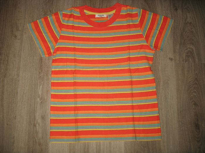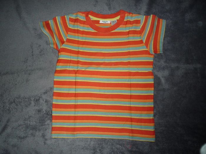 Tee shirt à manches courtes orange rayé vert / bleu / jaune - Col rond orange - Matière : 100% coton.