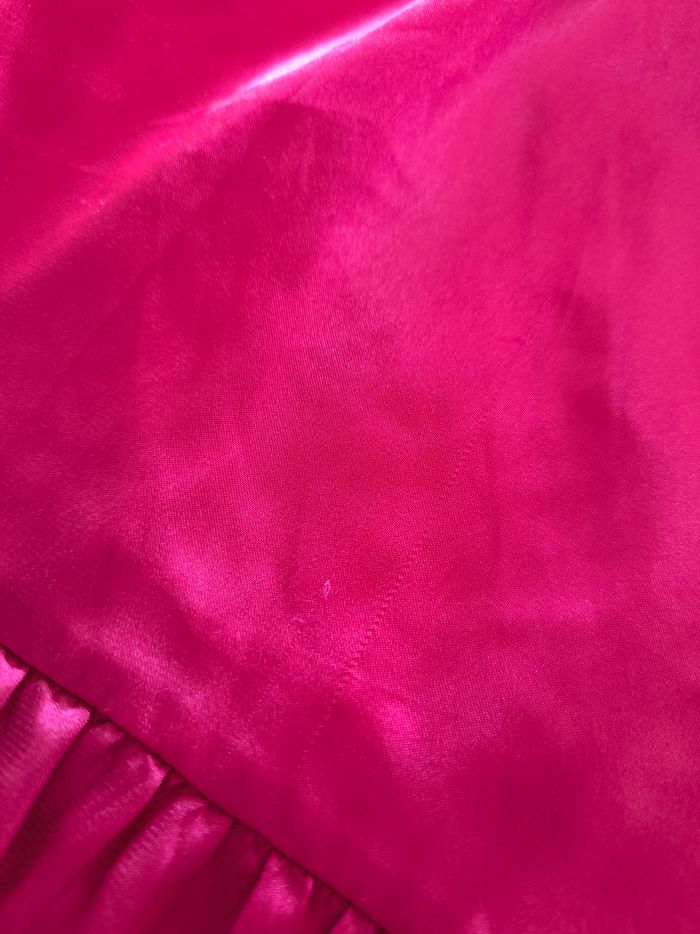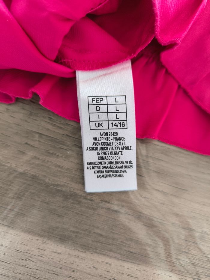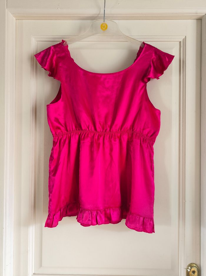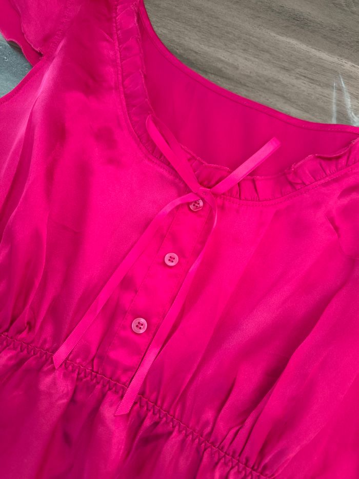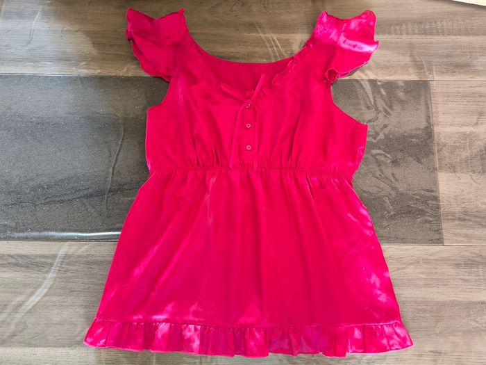 Haut de pyjama à manches courtes Marque Avon Taille L, 40 • Coloris rose • Boutons et nœud décoratifs au col • Élastique sous la poitrine • Volants • Matière satinée • Quelques fils de tirés Largeur aisselle à aisselle non étirée : 44 cm Largeur aisselle à aisselle étirée au maximum : 52 cm Longueur totale : 62 cm Longueur aisselle : 39 cm En très bon état #evelyne_taille_40