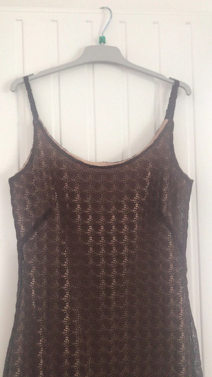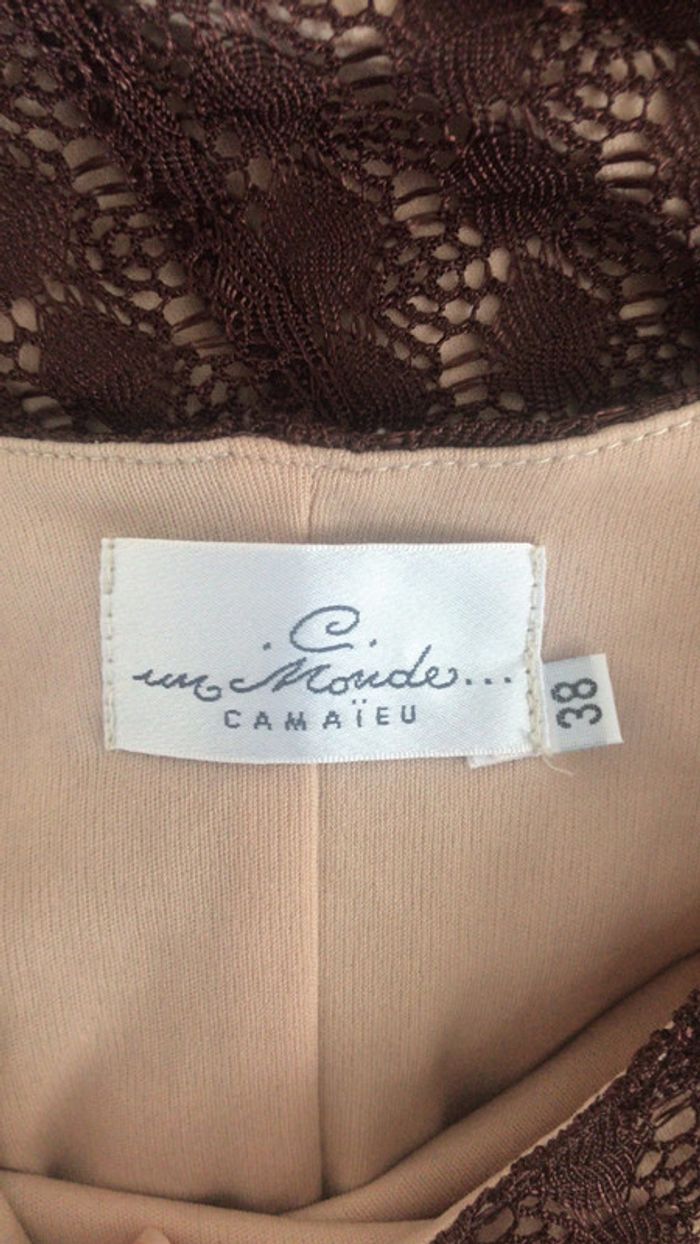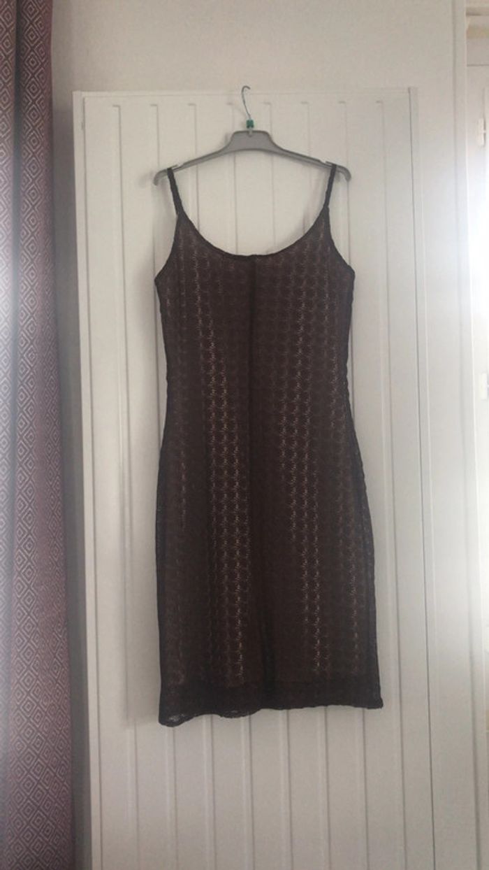 Robe droite Camaïeu avec tissu en crochet marron avec en dessous un tissu couleur chair pour masquer la transparence, pour une taille 38, en bon état