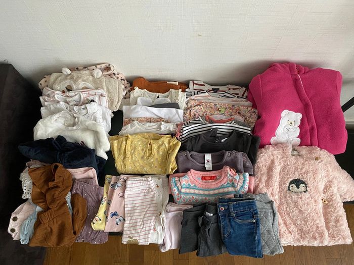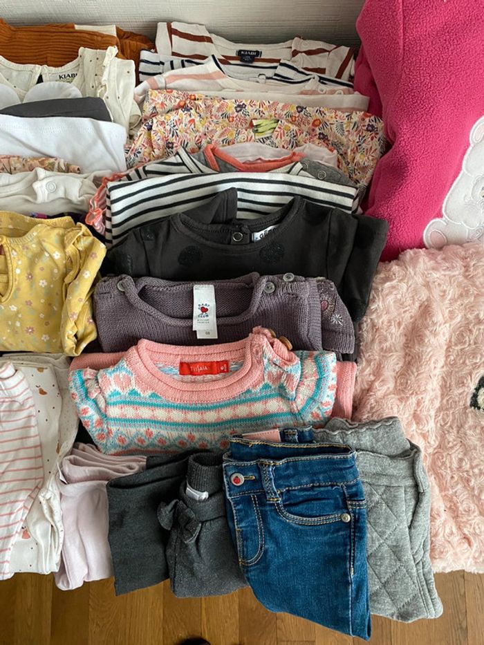 Gros lot vêtements 6 mois fille Comprends 43 articles Tout est en très bon état Si besoin je peux vous envoyer d’autres photos Comprends 1 combipilote 2 vestes 5 tee shirts manches courtes 4 robes pull 2 jeans 8 leggings 5 ensembles 2 pyjamas 2 grenouillères a capuche 1 gilet 1 pull 3 robes 1 jupe 1 bodie Différentes marques kiabi , vertbaudet, h&m…