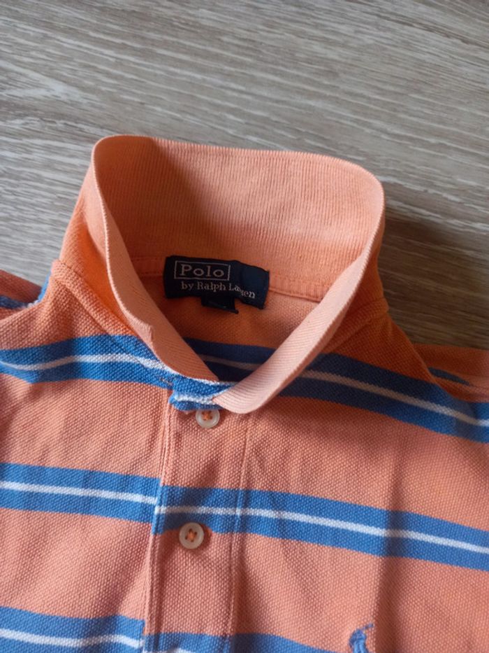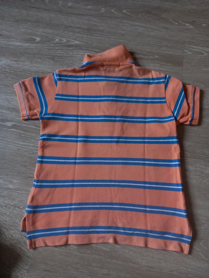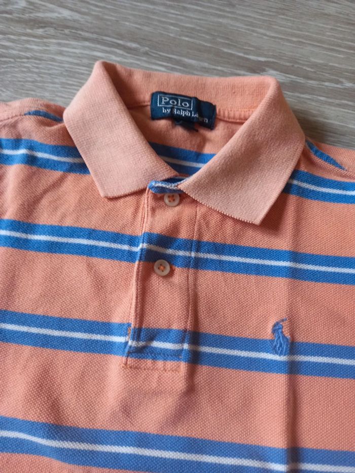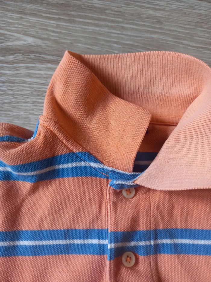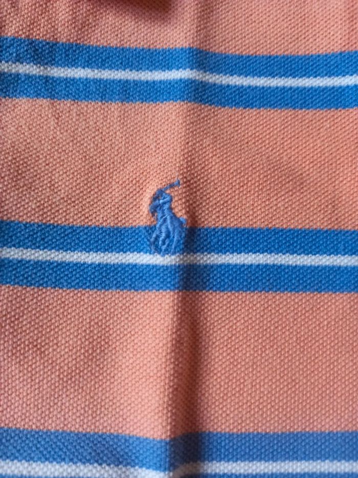Porté mais bon état Pas de trou Le col est décoloré et le revers des manches aussi. Ce n'est pas flagrant cela reste un beau polo Couleur abricot clair bleu et blanc