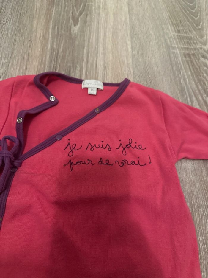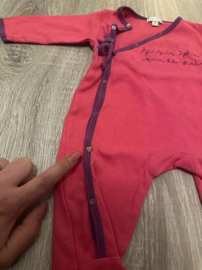 -pyjama léger pour fille, avec attache à l’avant jusqu’à la cheville. -taille: 6 mois. -marque: Dpam bébé. -en très bon état, je passerais un coup de rouleau avant l’envoie, les boutons ont perdu un peu de couleur, voir photo.