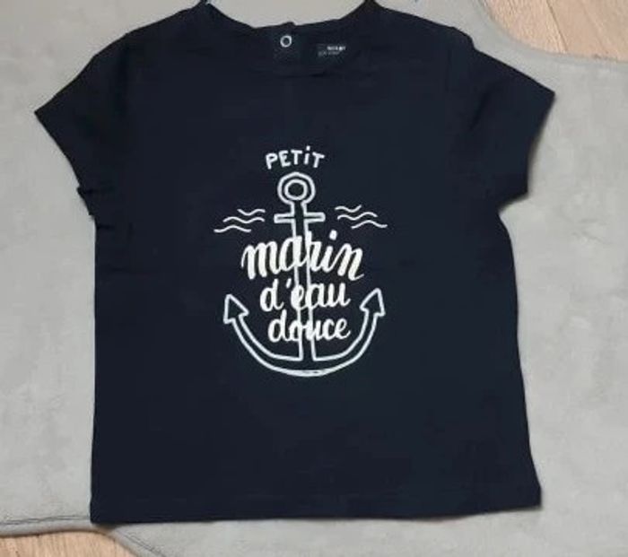 PRIX DE VENTE FERME MERCI Tee-shirt Manches courtes Bleu marine inscription "petit marin d'eau douce" 24 mois en parfait état Pour visualiser tous ce que je possède en 24 mois garçon : #ambre6269024mgarçon