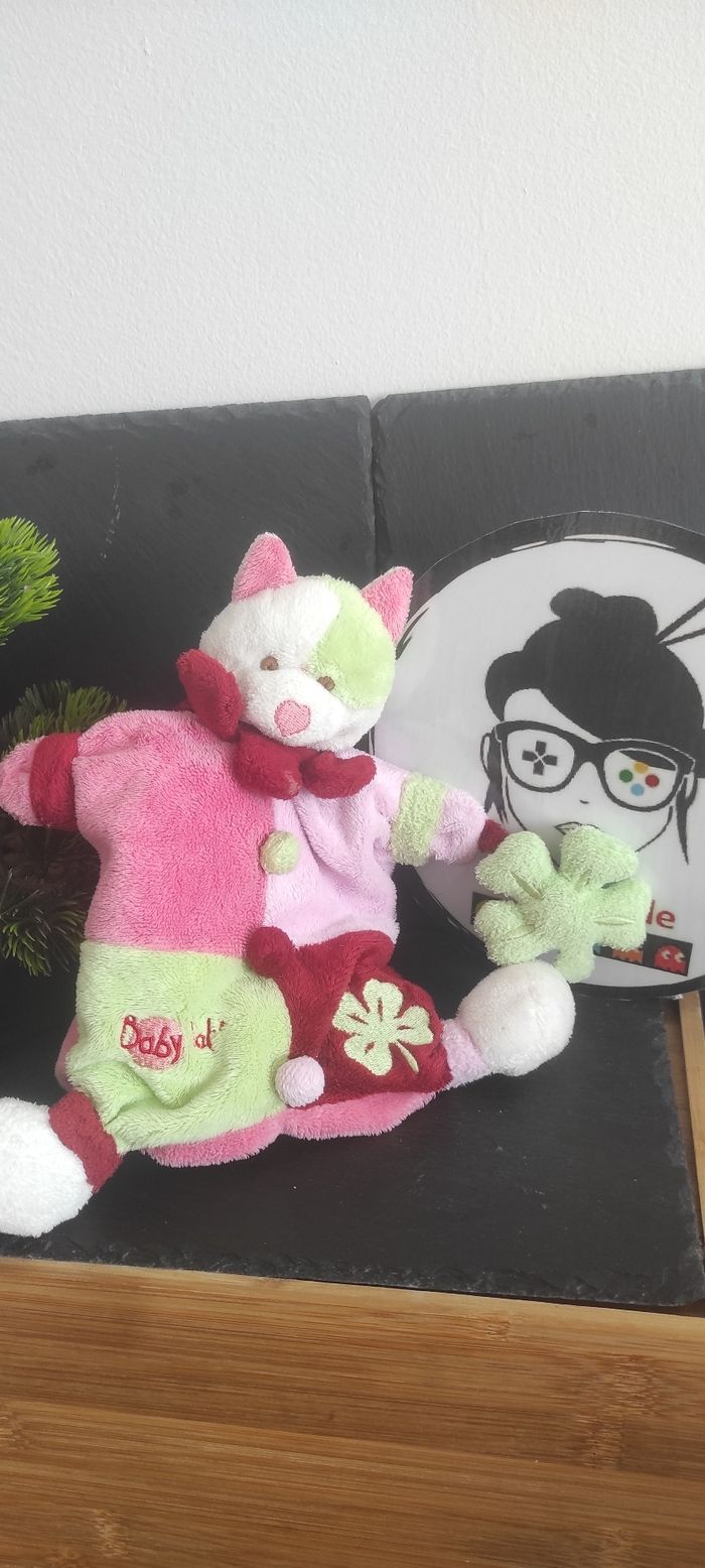 Marionnette doudou chat rose vert Baby Nat' Trèfle   Coeur Bouton Ancien Carreau - photo numéro 1