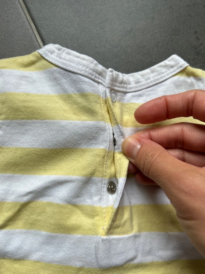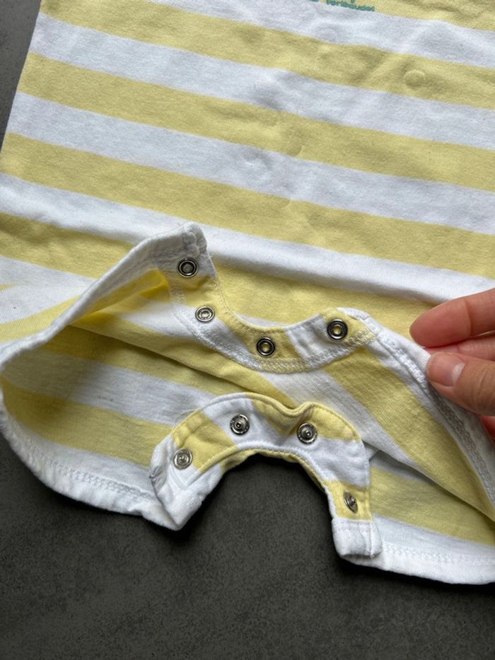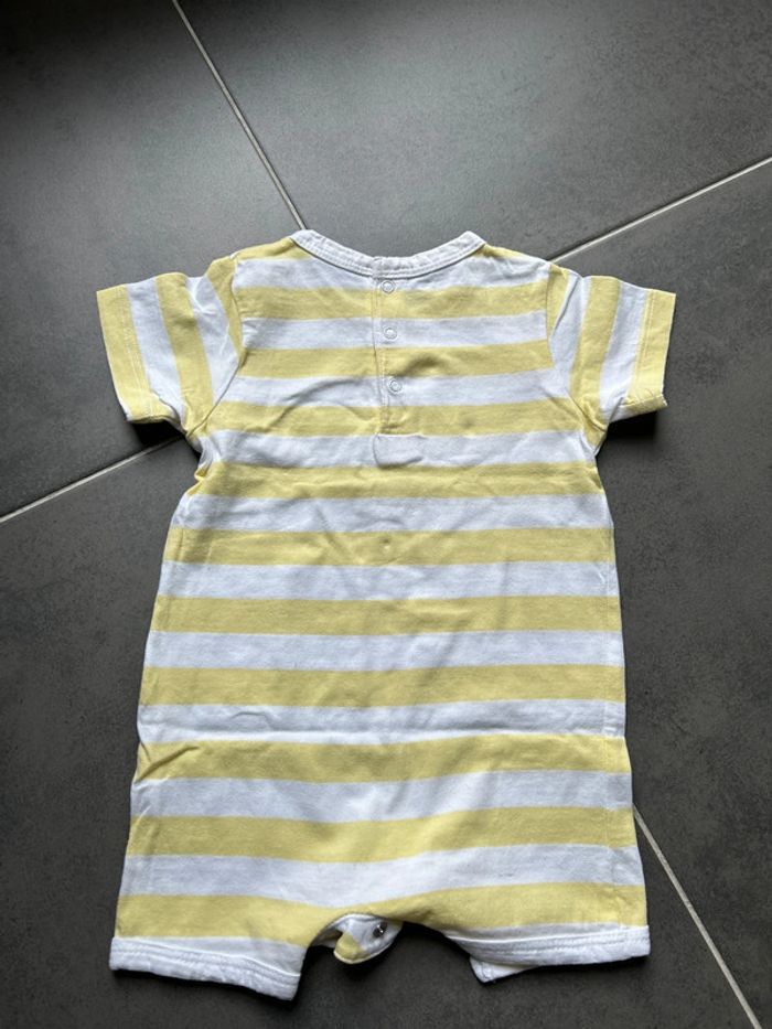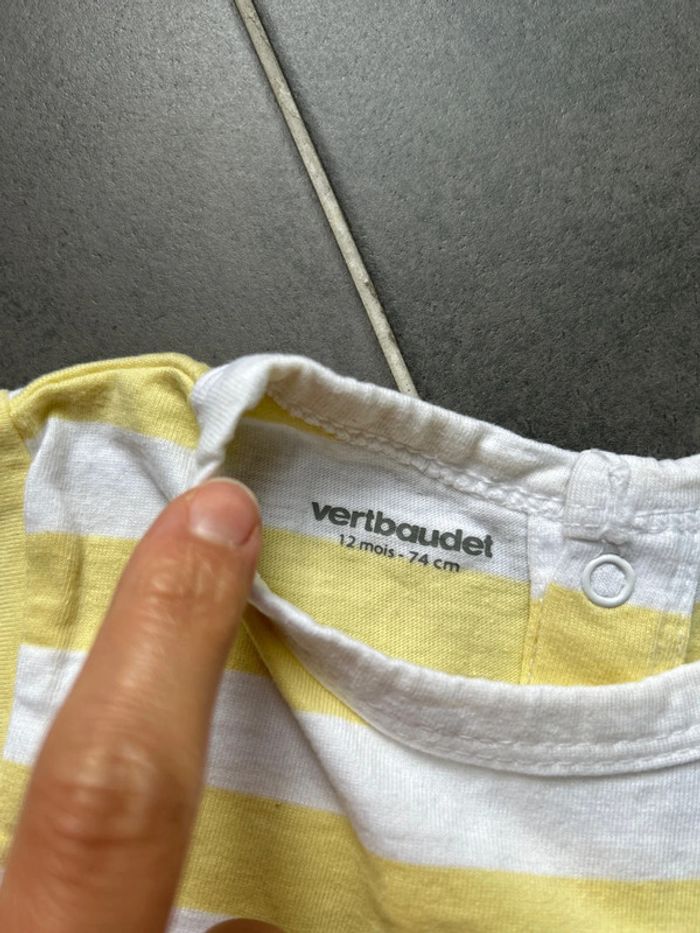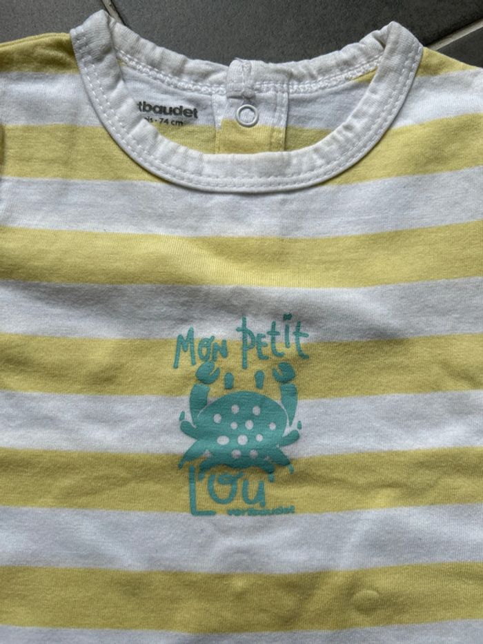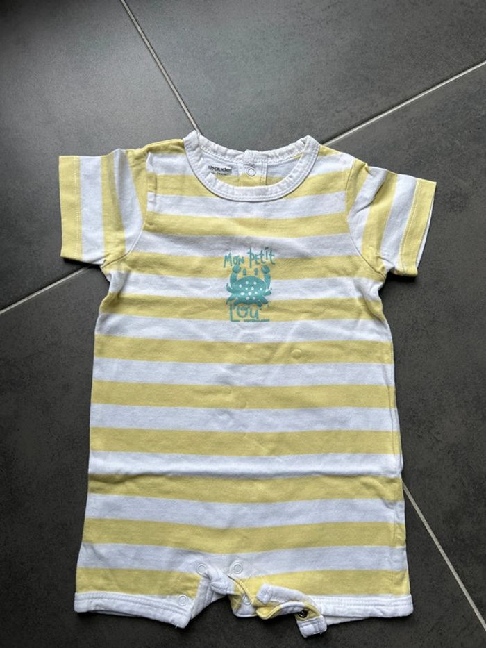 Marque: verbaudet Taille: 12 mois 74 cms ( taille petit ) Couleur: blanc et jaune Particularité: Manches courtes Pressions en haut du dos+entre jambes Motif crabe et écriture « mon petit lou » Lavé et repassé État: neuf sans étiquette