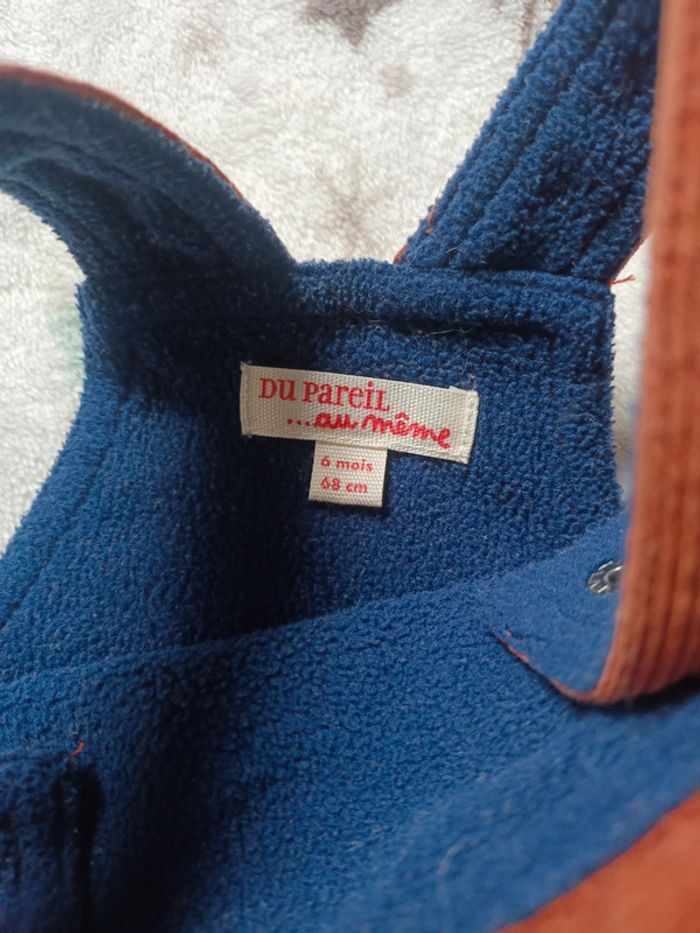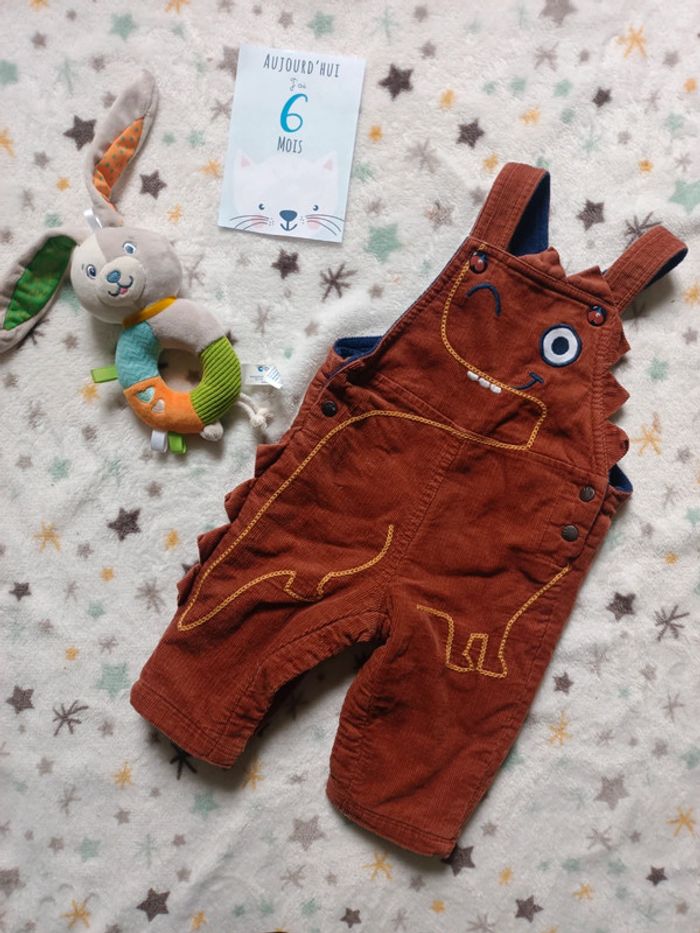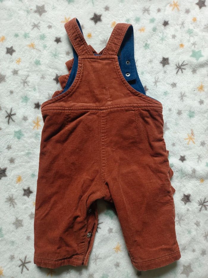 Salopette en velours marron brodé motif dinosaure, doublé polaire bleu. Bien chaude. Du pareil au même (DPAM), 6 mois. G165