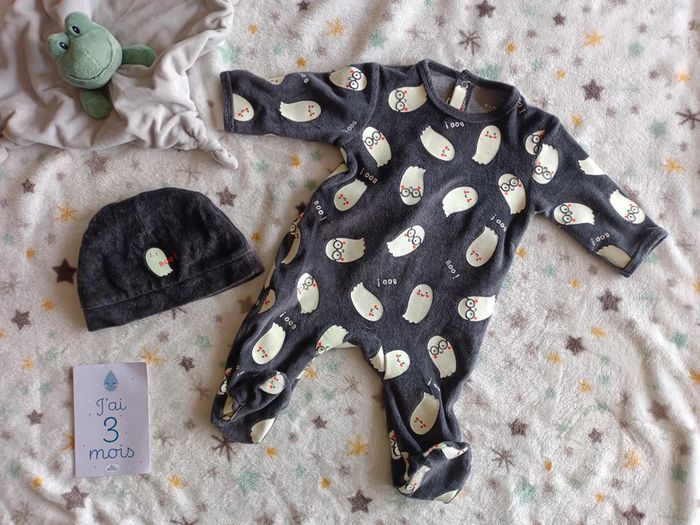 Pyjama Kiabi motifs fantômes phosphorescents avec bonnet assorti. Taille 3mois. 🐸 La peluche n'est pas à vendre 🐸 G163