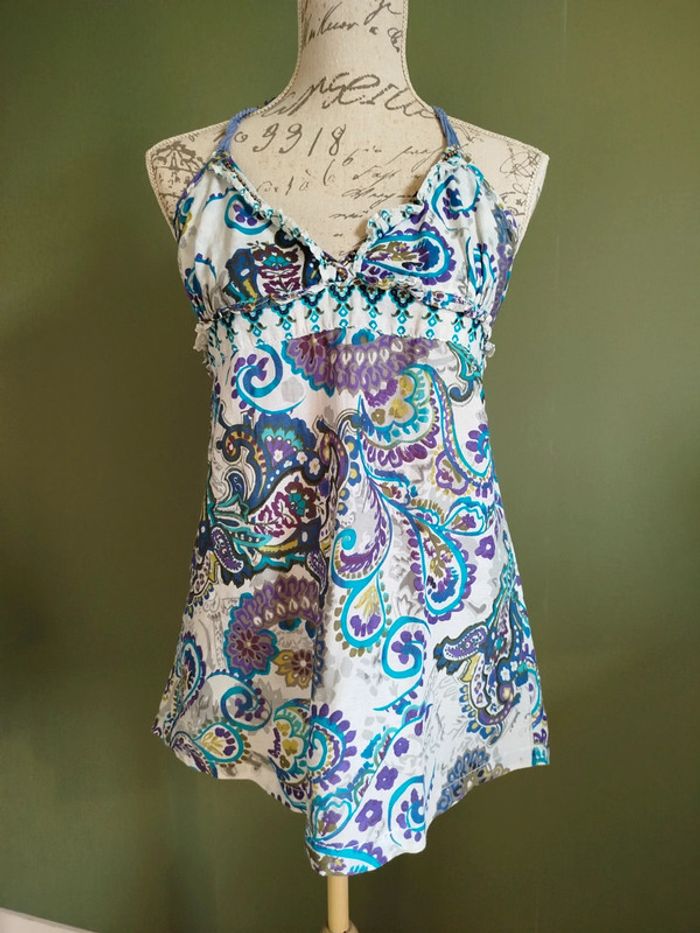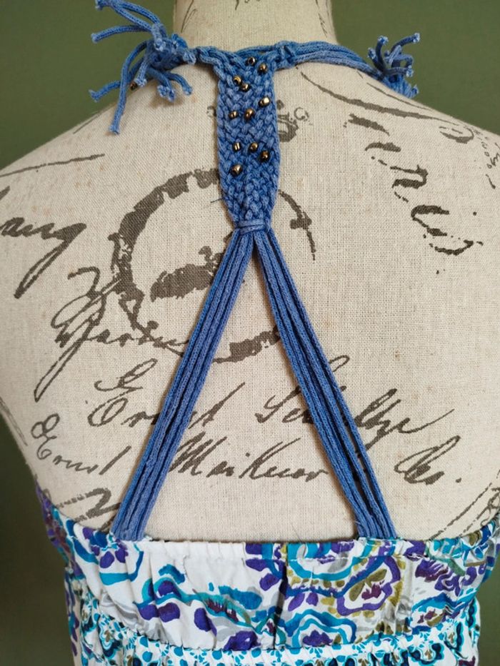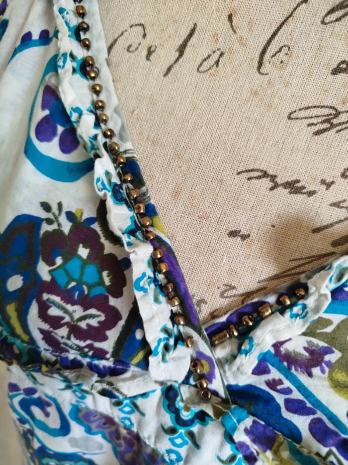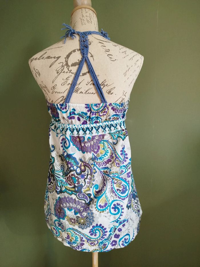 Tunique blanche à motifs bleu et violet. Bretelles en macramé et petites perles. Taille M. Tous les articles de cette taille dans mon dressing : #laurined61_mfemme G77