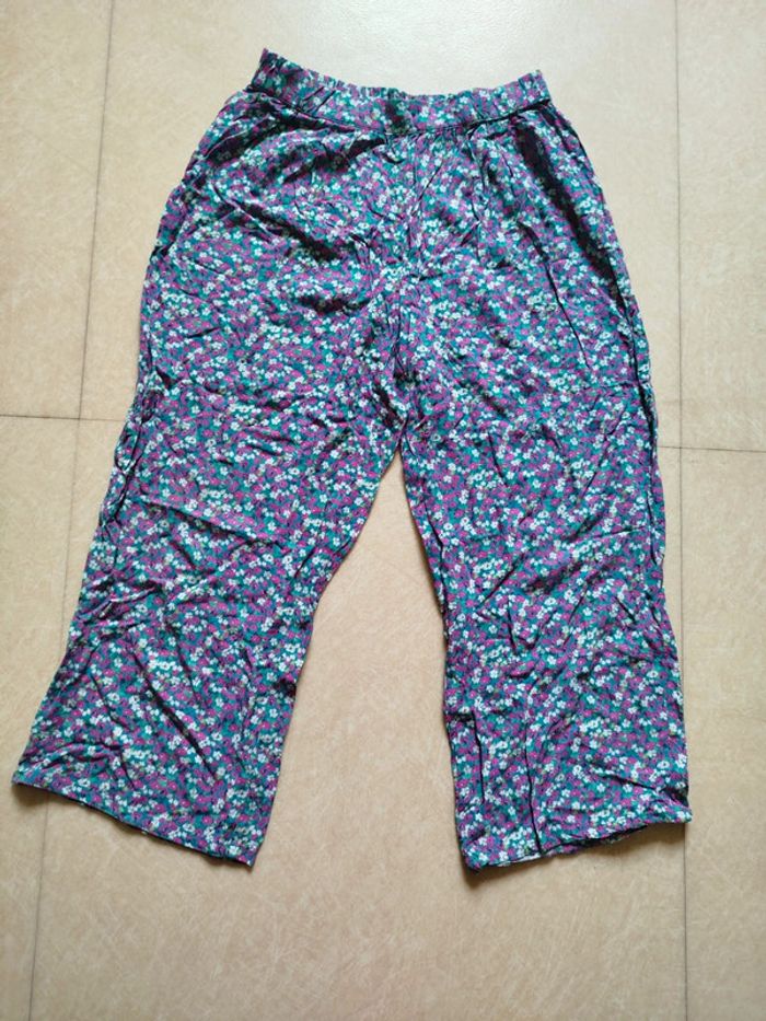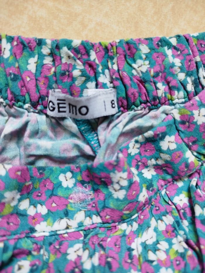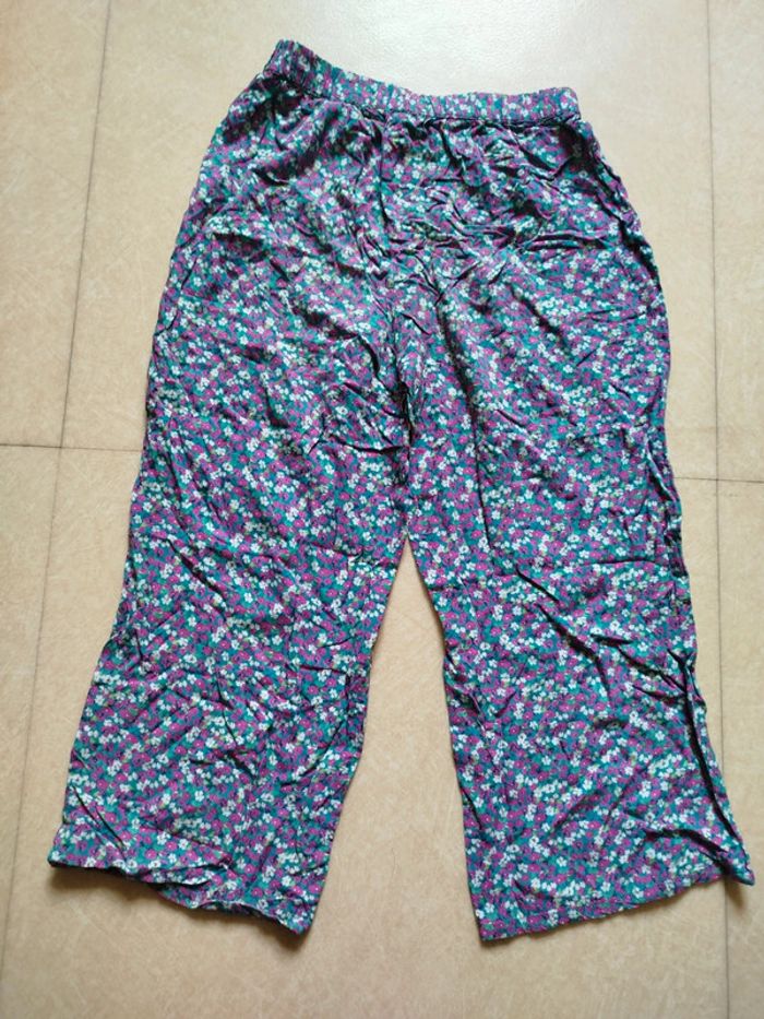 Pantalon léger, fluide. Vert, motifs fleurs rose et blanche. Petit nœud sur le devant de la ceinture manquant ( voir dernière photo ). Gemo, 8ans. G97