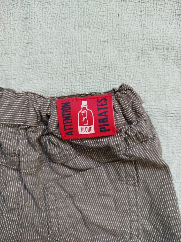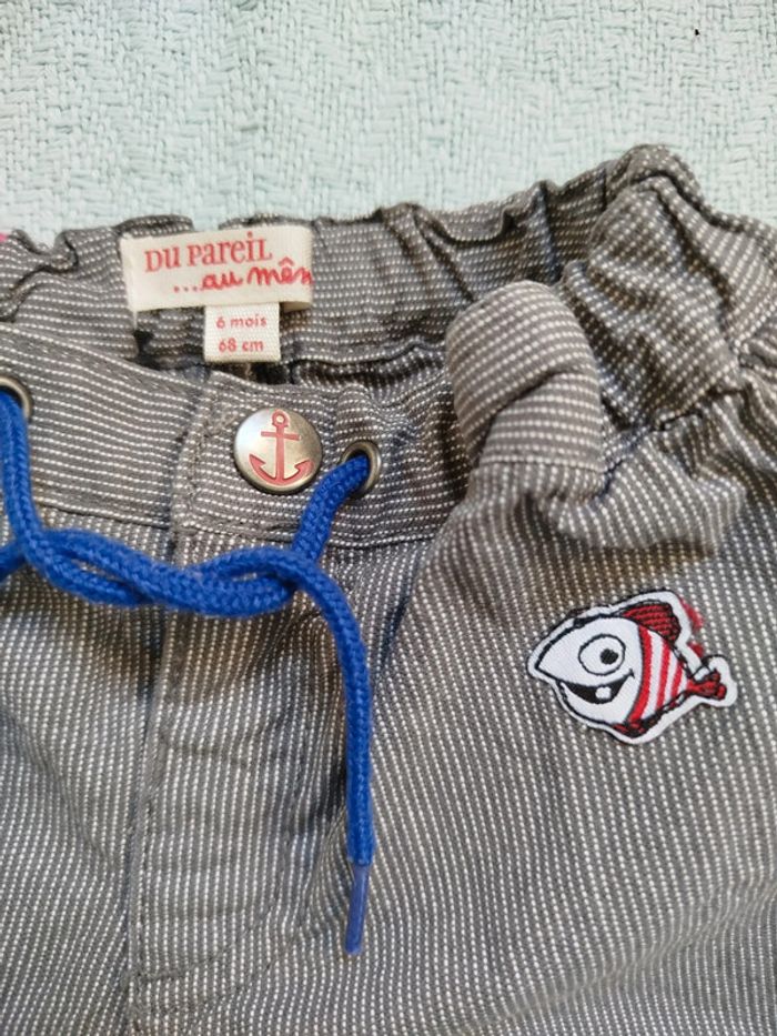 Pantalon légé rayé avec écussons poisson et pirate. Ajustable à la taille. Du pareil au même, 6 mois. Très peu porté. G70