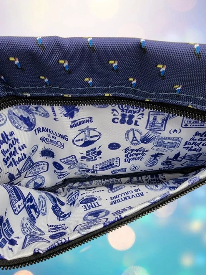Cabaïa Pochette frontale Boulder beach (bleu avec motifs toucan) Ancienne version avec l’intérieur blanc à motifs Neuve Dimensions : 25cm x 15cm Les pochettes avant sont compatibles avec les 3 tailles de sacs à dos (Small, Medium, Large) et avec tous les sacs sauf les sacs bandoulières Nano et Crossbody #cabaïa #pochette
