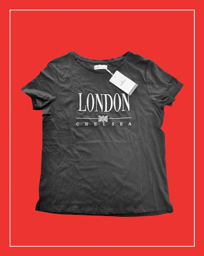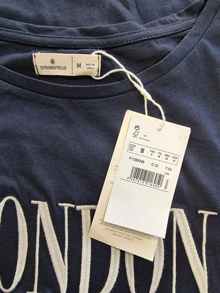 Spingfield T-Shirt femme Bleu marine avec broderie London Taille M Neuf avec étiquette Vendu 19,99 € sur le site Coupe droite à manches courtes 100% coton Longueur: 61 cm Aisselle à aisselle: 48 cm #springfield #tshirtfemmemarine CC.801.3