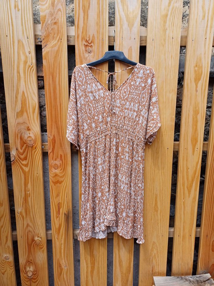🏷 Marque : Gémo ✂️ Catégorie : Robe, robe été, robe midi, robe manches courtes 📒 Détails : Cordon sous la nuque, large élastique à la taille 🧶 Matière : Etiquette absente (léger et fluide) 🎨 Couleur : Tâches ocres marrons et blanches 🪡 État : En excellent état 📏 Taille : 48 📐 Mesures : Longueur : 101 cm Largeur aisselle à aisselle : 56 cm 💬 N'hésitez pas à me poser toutes vos questions 📦 Envois rapides et soignés, ok tout transporteur 🎁 Réduction sur les lots