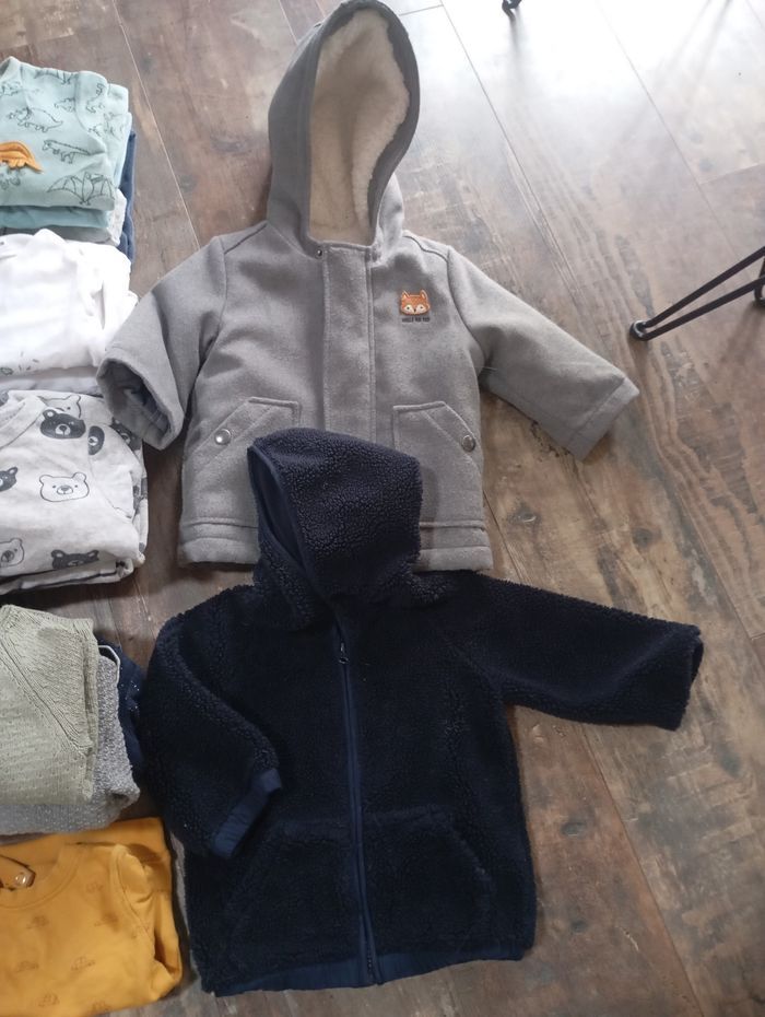 Ensemble de 68 pieces 12 mois, en très bon état : 1 manteau 1 gilet très chaud 1 pull 4 vestes/gilet 13 pyjamas velours 21 bodies manches longues 1 ensemble jogging rouge (haut+bas) 11 t-shirt manches longues 11 pantalons 2 shorts 2 paires de chaussures Lot entier 60€ Possibilité de vente au détail.