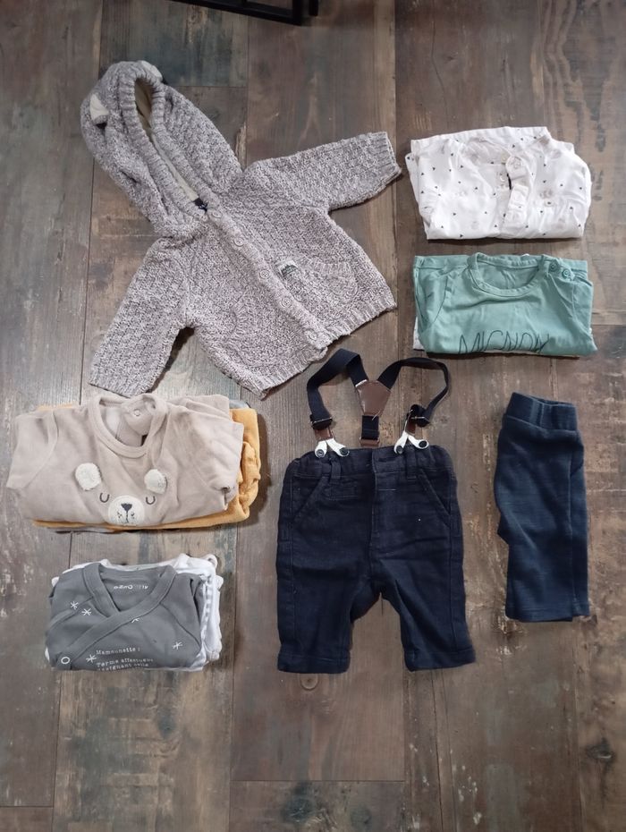 Ensemble de 25 pièces: - 1 mois: 1 gilet 1 chemise manches longues 2 t-shirts manches longues 1 pantalon 1 pantalon avec bretelles 3 pyjamas velours 6 bodies manches longues - Naissance: 2 ensembles (salopettes+ t-shirts manches longues) 8 bonnets Lot entier 20€ Possibilité de vente au détail.