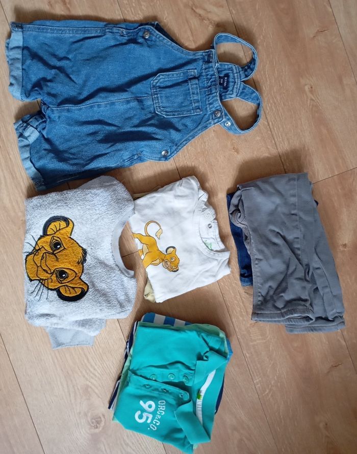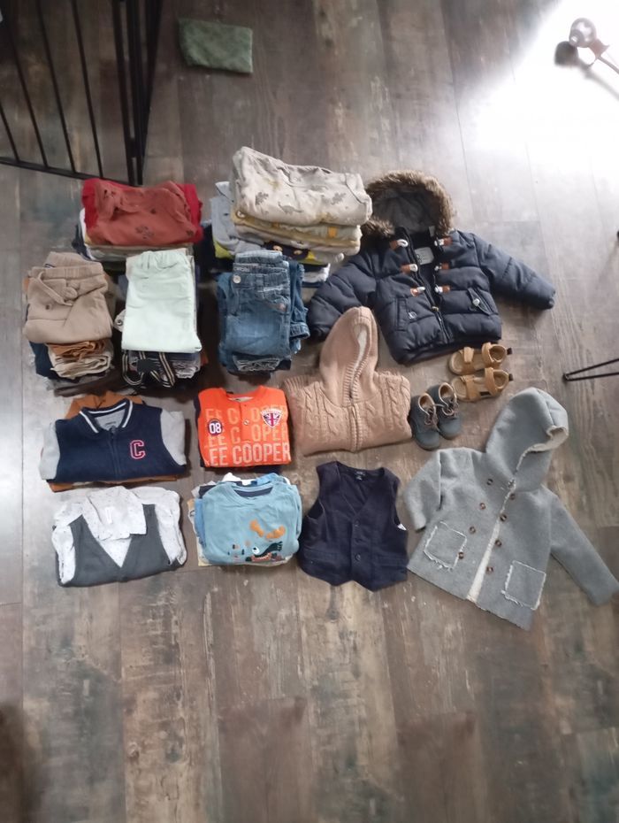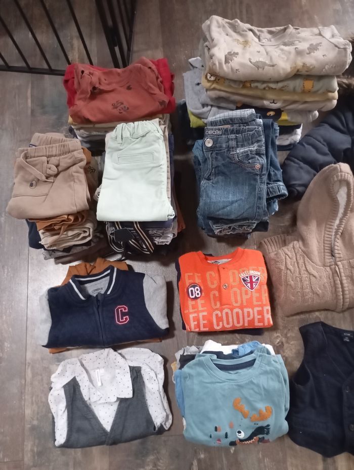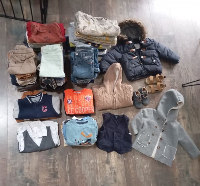 Ensemble de 89 pièces: 16 bodies 12 pyjamas velours 1 pyjamas mi-saison 2 pieces manches longues 2 gilets / vestes 2 pulls 1 chemise manches longues avec gilet barman 14 t-shirts manches longues 4 t-shirts manches courtes 1 gilet barman 30 pantalons 2 manteaux hiver 1 gilet très chaud 1 salopette short 1 paires de sandales 1 paires de chaussures Lot entier 80€ Possibilité de vente au détail.