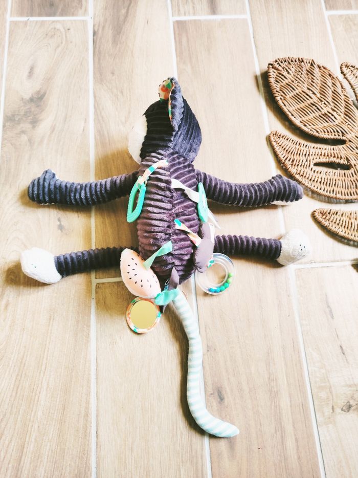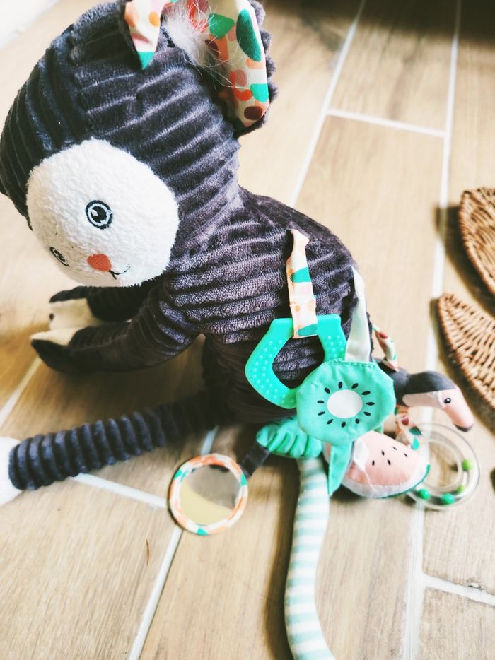 🐒Peluche d'éveil Spirale multi activités sensorielles Kezakos le ouistiti en tissus marque Les Deglingos