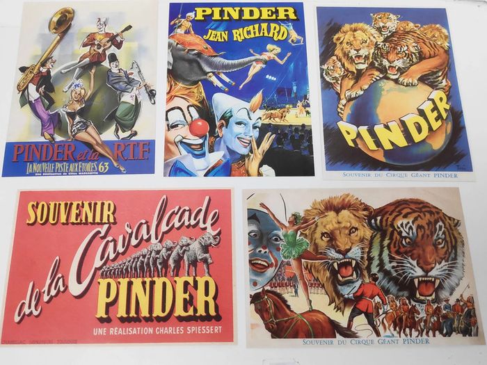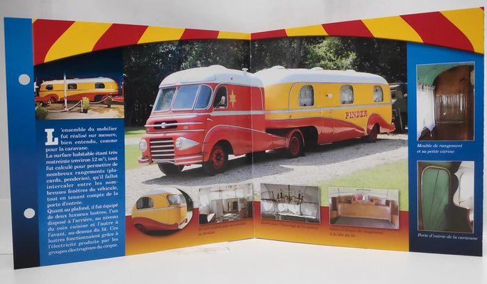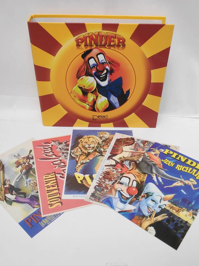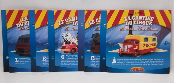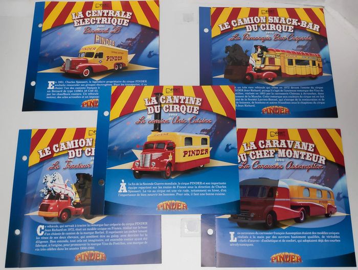 Classeur cirque Pinder avec fiches : la centrale électrique, la cantine du cirque, la caravane du chef monteur, la remorque snack-bar du cirque. 5 cartes postales inclues