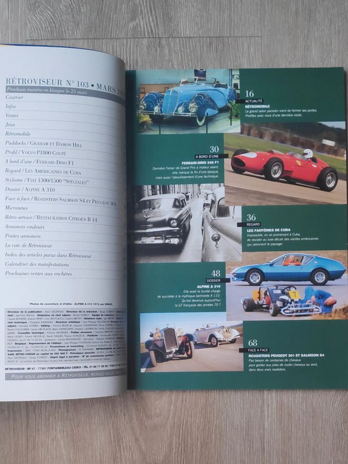 #_Rétroviseur_ numéro 103 (mars 1997) Dossier Alpine A310, Ferrari Dino 246 F1, roadsters Salmson S4 et Peugeot 301, Fiat 1300/1500 spéciales, Volvo P1800 Coupé, Citroën B 14... 162 pages #_Alpine_ #_Ferrari_ D'autres numéros disponibles dans mon dressing