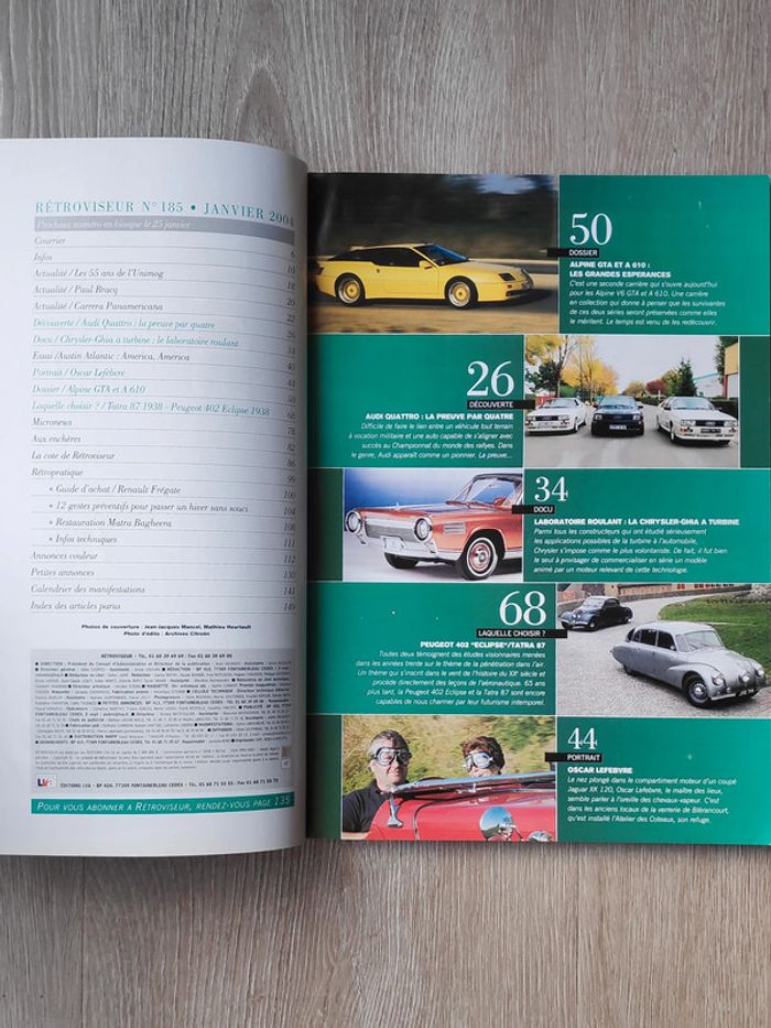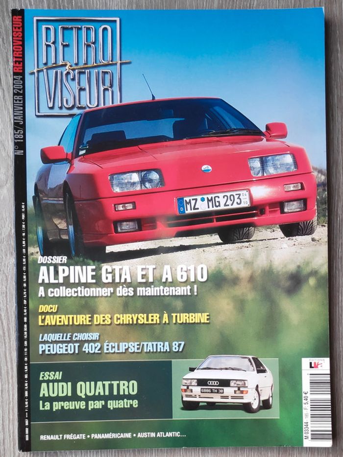 #_Rétroviseur_ numéro 185 (janvier 2004) Dossier #_Alpine_ GTA et A 610 Audi Quattro, Peugeot 402 Éclipse vs Tatra 87, Chrysler-Ghia, Renault Frégate, Carrera Panamericana, Matra Bagheera... 156 pages D'autres numéros disponibles dans mon dressing