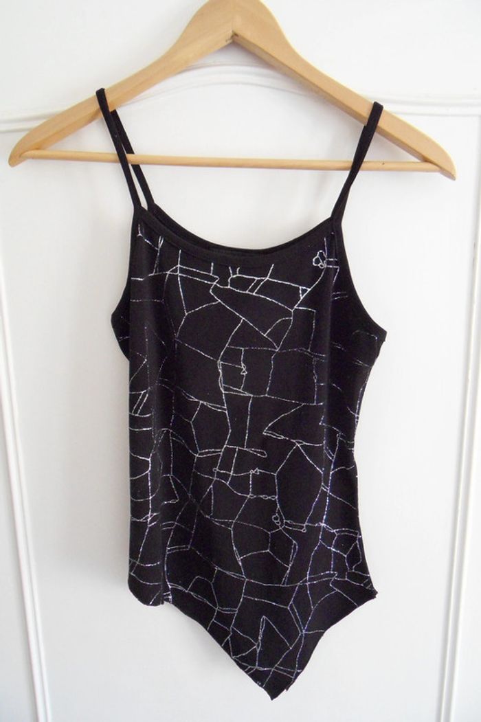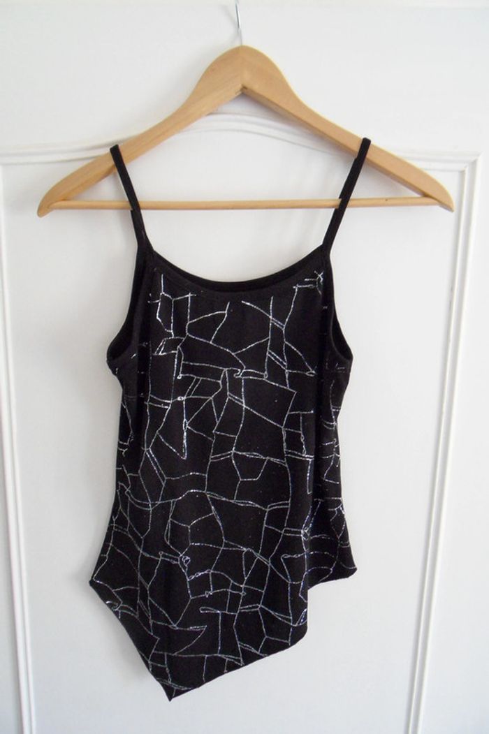 Débardeur noir à fines bretelles avec motifs géométriques pailletés. 92% polyester, 8% élasthanne. Longueur 50 cm environ.