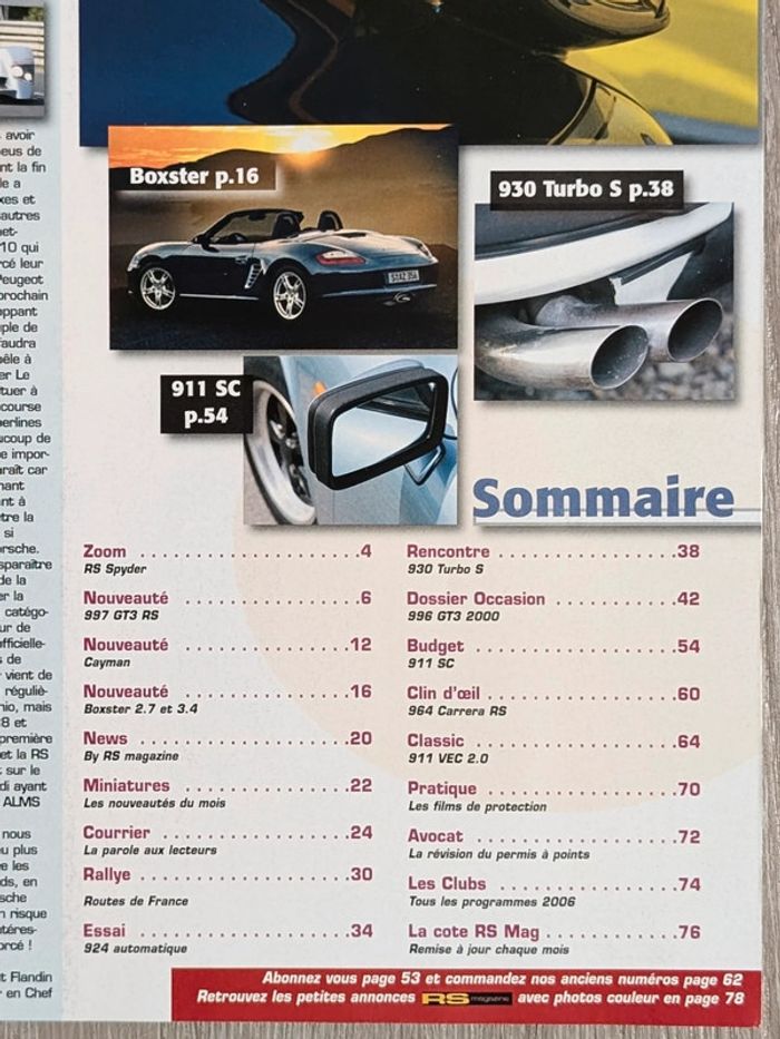 #_Porsche_#_RSmag_ Numéro 61 (juillet 2006) RS Spyder, 997 GT3 RS, Cayman, Boxster 2.7 et 3.4, 924 automatique, 930 Turbo S, 996 GT3 2000, 911 SC, 964 Carrera RS, 911 VEC 2.0... 132 pages D'autres numéros disponibles dans mon dressing