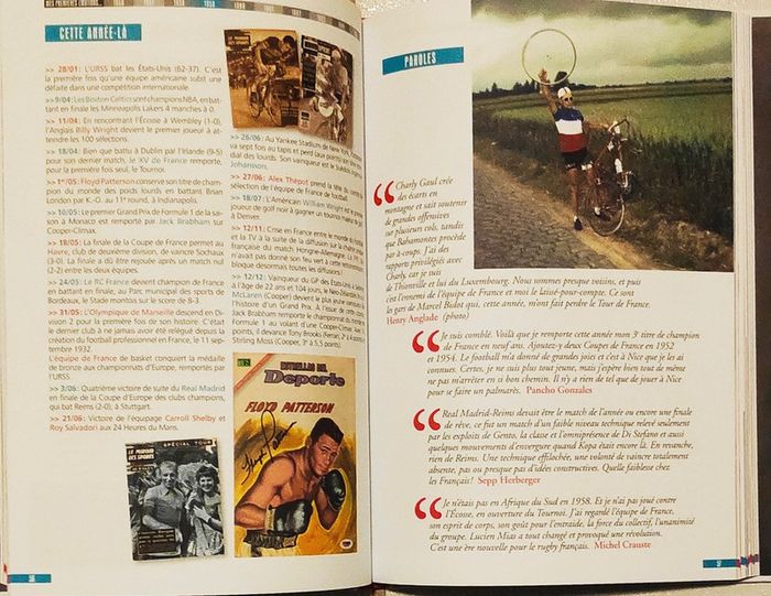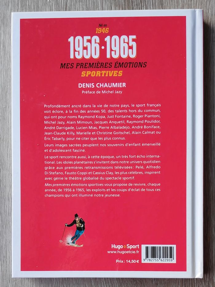 #_Livre_#_sport_ 1956-1965 - Né en 1946, Mes premières émotions sportives Raymond Kopa, Juan Manuel Fangio, Fausto Coppi, Michel Jazy, Just Fontaine, Jacques Anquetil, Pelé, Marielle Goitschel, Raymond Poulidor, Jean-Claude Killy, Bob Beamon, Jim Clark, Christine Caron, Guy Drut, Eddy Merckx, Colette Besson, Cassius Clay, Yannick Noah, Jean-Pierre Rives, Mark Spitz, Bernard Hinault, Michel Platini et tant d'autres champions ou championnes… Chaque année est découpée de la façon suivante : L'événement Les six histoires qui comptent Les 20 figures incontournables Les chiffres clés Les principaux événements Les phrases chocs Les naissances, les décès Les repères historiques 144 pages
