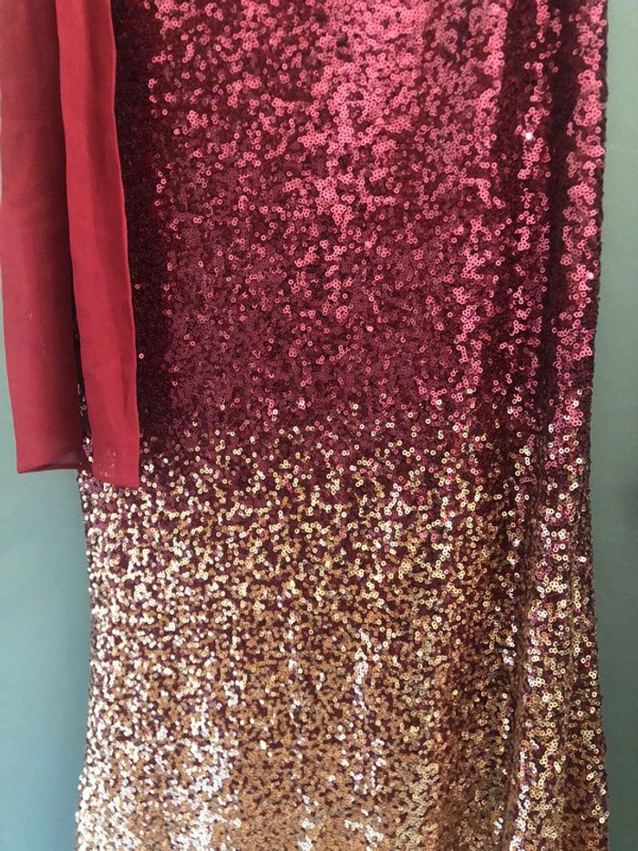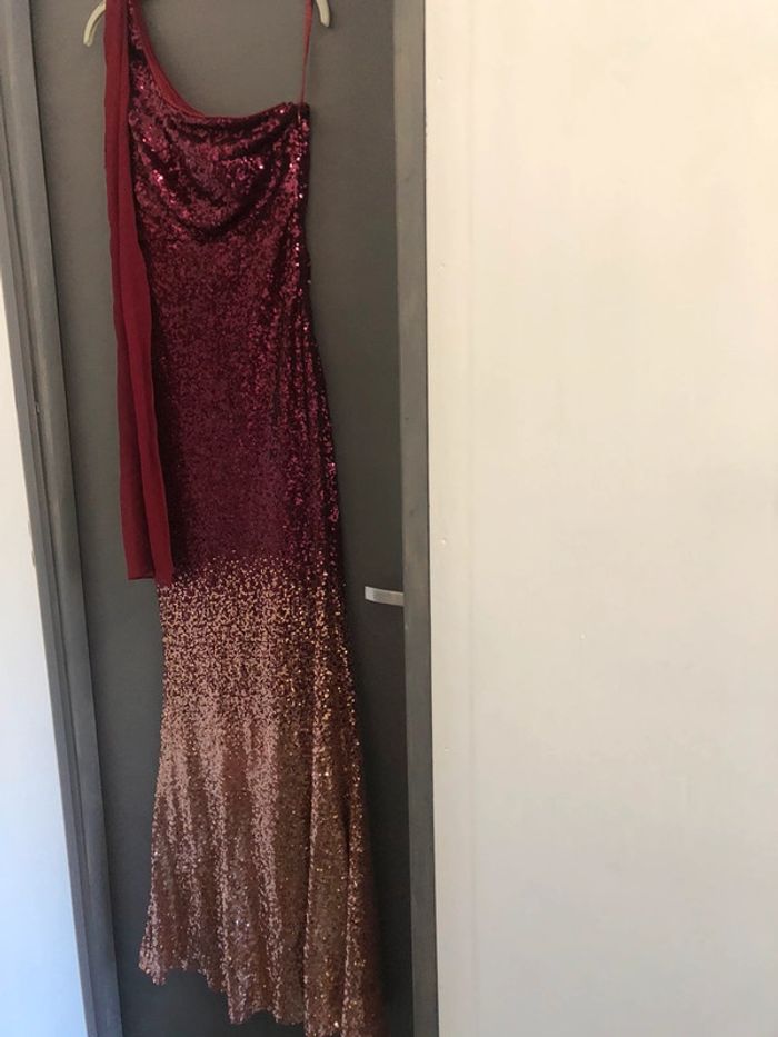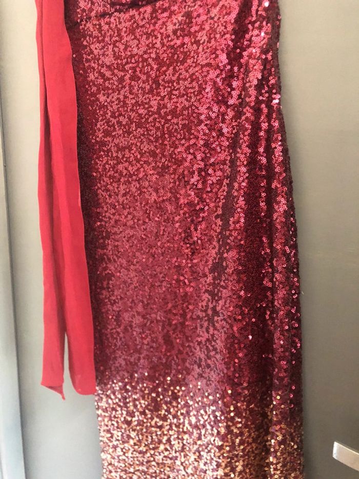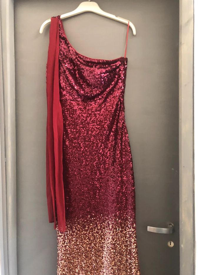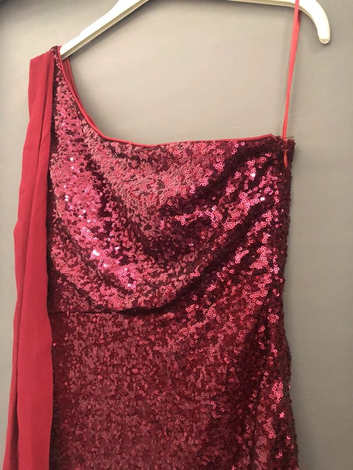 Robe longue cocktail coupe sirène à l’épaule asymétrique. Une seule bretelle. Ruban pour faire un noeud ou laisser pendre.