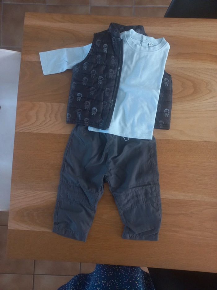 Excellent état Pantalon gris doublé Tee-shirt bleu ciel Doudoune sans manche avec dessin d'astronaute Je ne sais plus la marque! 😊 Taille 12 mois