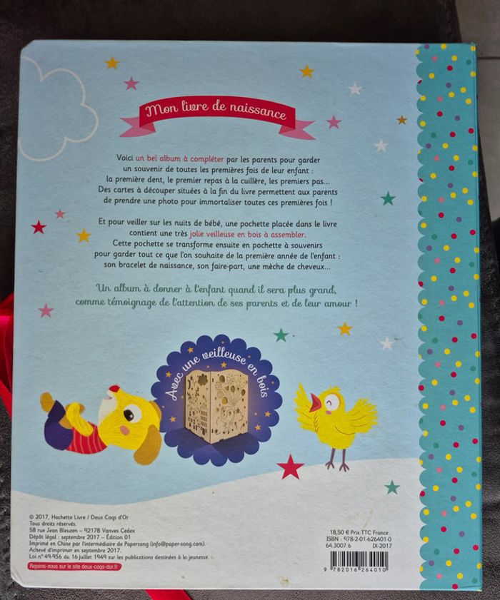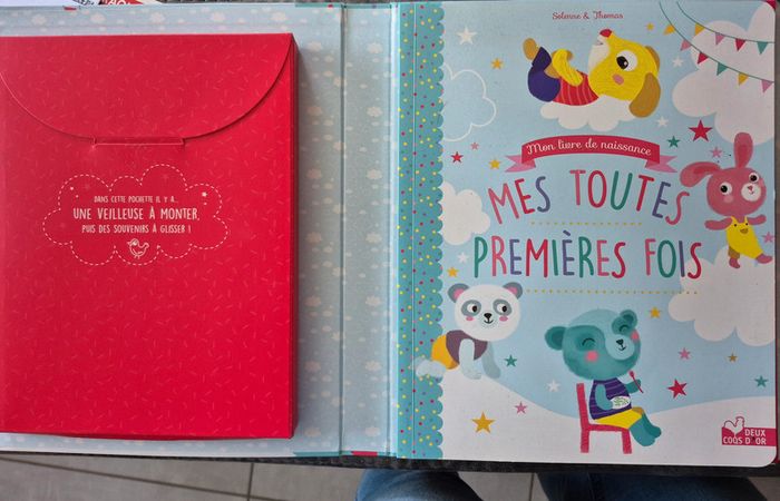 Afin de pouvoir financer les frais paramédicaux de nos enfants, j'offre une seconde vie à nos objets. Merci de bien lire la description : Livre de naissance à compléter par les parents pour garder un souvenir de toutes les premières fois de leur enfant : la première nuit complète, la première dent, le premier repas à la cuillère, les premiers pas... Puis à donner à l'enfant quand il sera plus grand, comme témoignage de l'attention de ses parents et de leur amour ! Attention: Il manque juste la veilleuse. -> RMP possible dans le département 54 / proche 88 (plus de précisions dans ma bio) 296