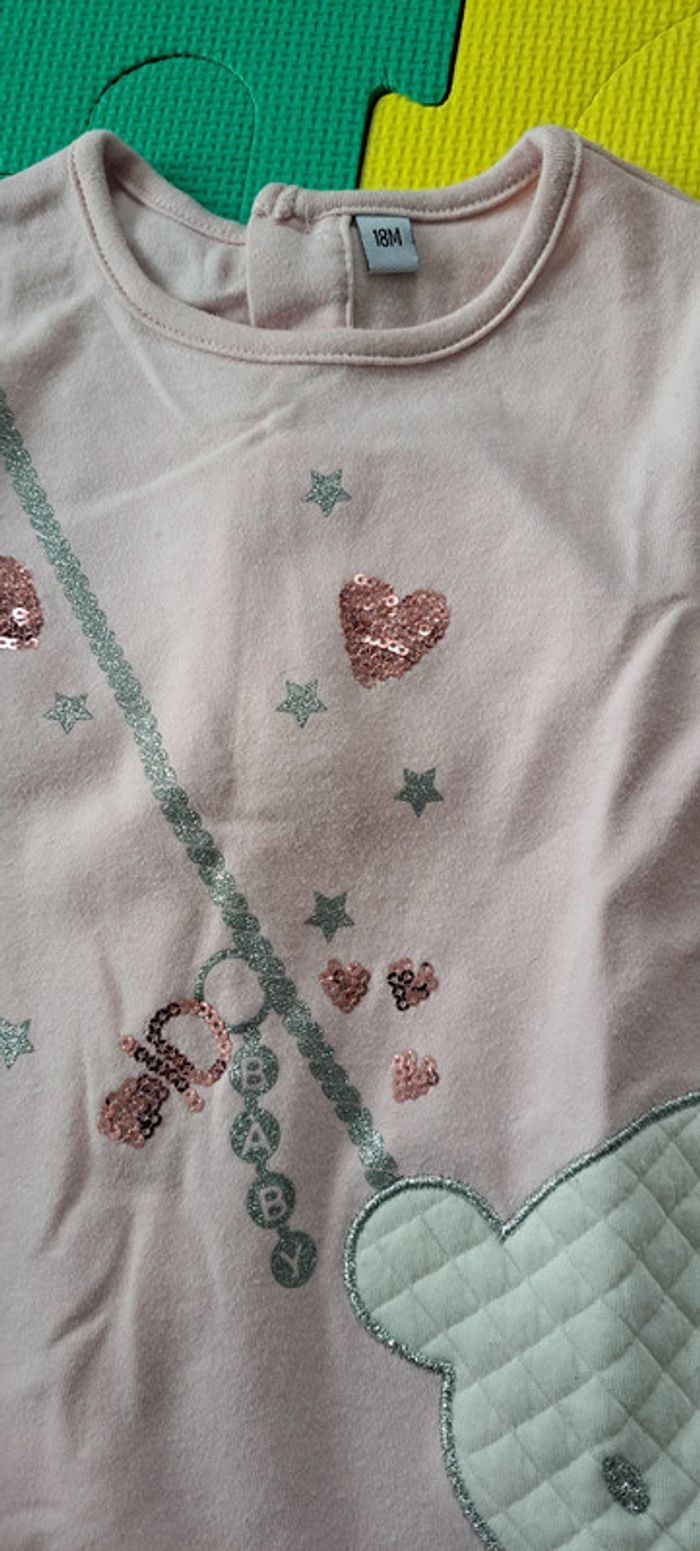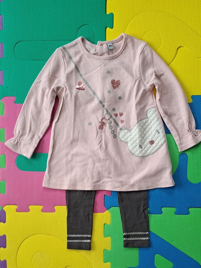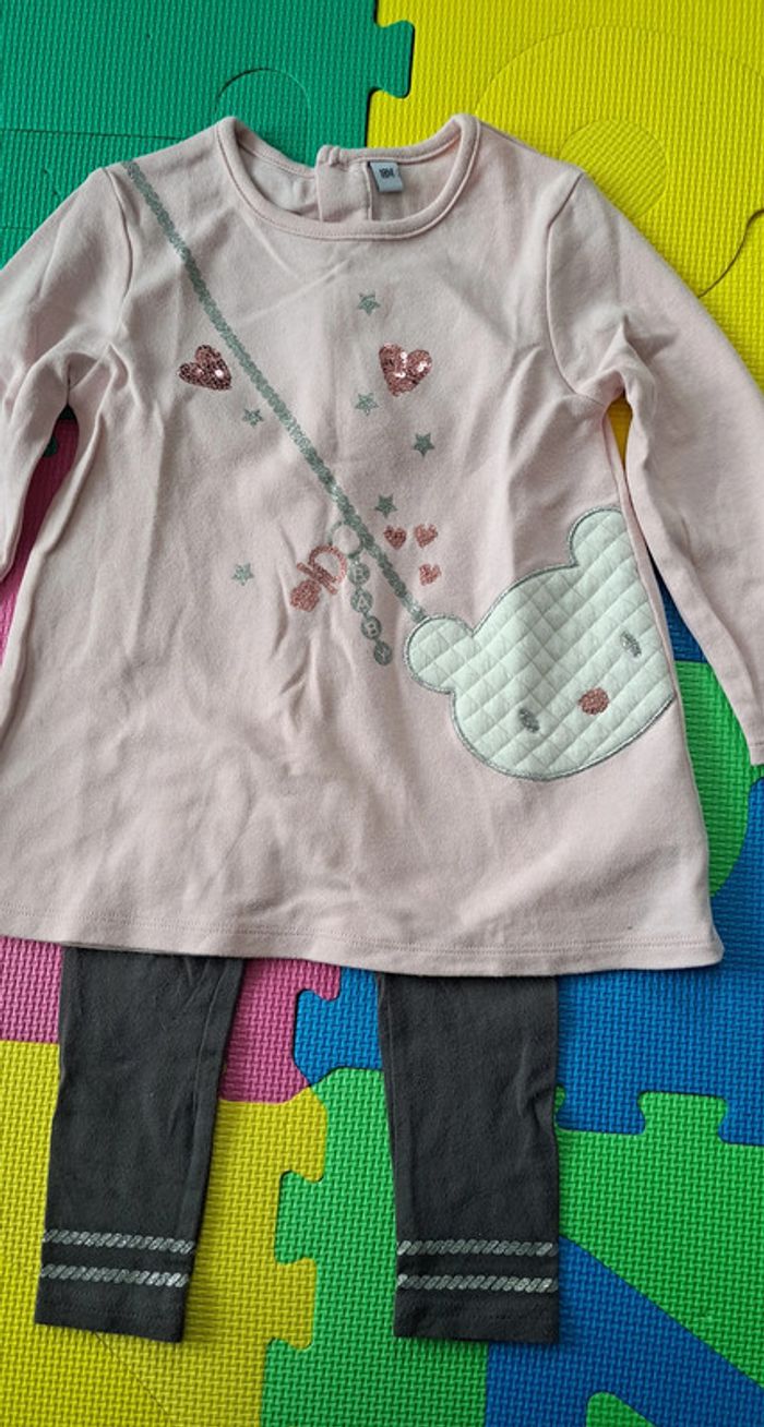 Afin de pouvoir financer les frais paramédicaux de notre fille, j'offre une seconde vie à nos vêtements. Merci de bien regarder les photos et lire la description : Ensemble Carrefour, taille 18 mois : - Haut/tunique rose à paillette et ourson - Legging gris, bandes argentées sur le bas Porté souvent mais encore en bon état -> Les articles sont stockés dans des sacs sous-vide et peuvent donc être froissés -> RMP possible dans le département 54 / proche 88 (plus de précisions dans mon profil) 63