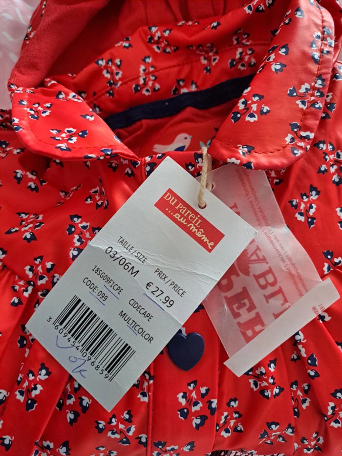 Afin de pouvoir financer les frais paramédicaux de notre fille, j'offre une seconde vie à nos vêtements. Merci de bien regarder les photos et lire la description : Cape cirée Du Pareil Au Même Taille 3/6mois – 68 cm Neuve, jamais portée. Il y a encore les étiquettes. Fermeture par boutons pressions sur le devant Capuche non amovible -> Les articles sont stockés dans des sacs sous-vide et peuvent donc être froissés -> RMP possible dans le département 54 / proche 88 (plus de précisions dans mon profil) 17