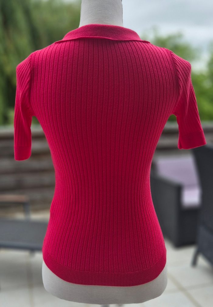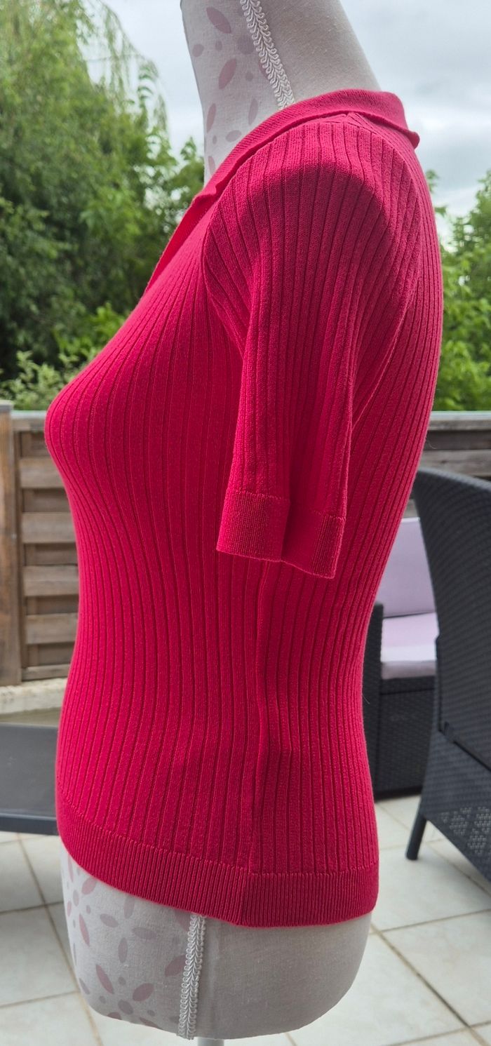 Pull fin rose Col polo et décolleté en V Manches courtes Modèle doux et léger Matière viscose polyamide