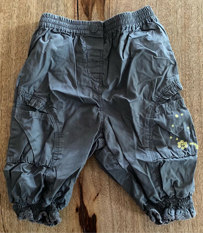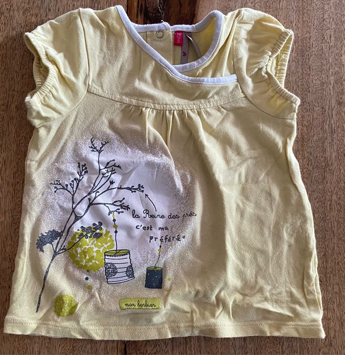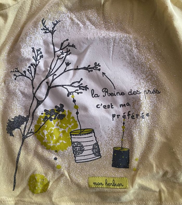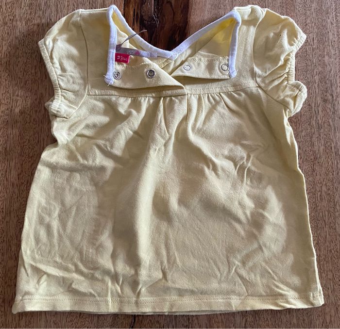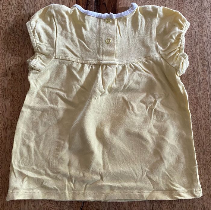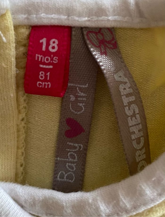 t-shirt jaune avec un dessin sans tache 2 pression dans le dos pour l’ouverture. Pantalon gris avec dessin en bas du pantalon de couleur jaune sans tache. 1 pression pour l’ouverture du pantalon. 18 mois