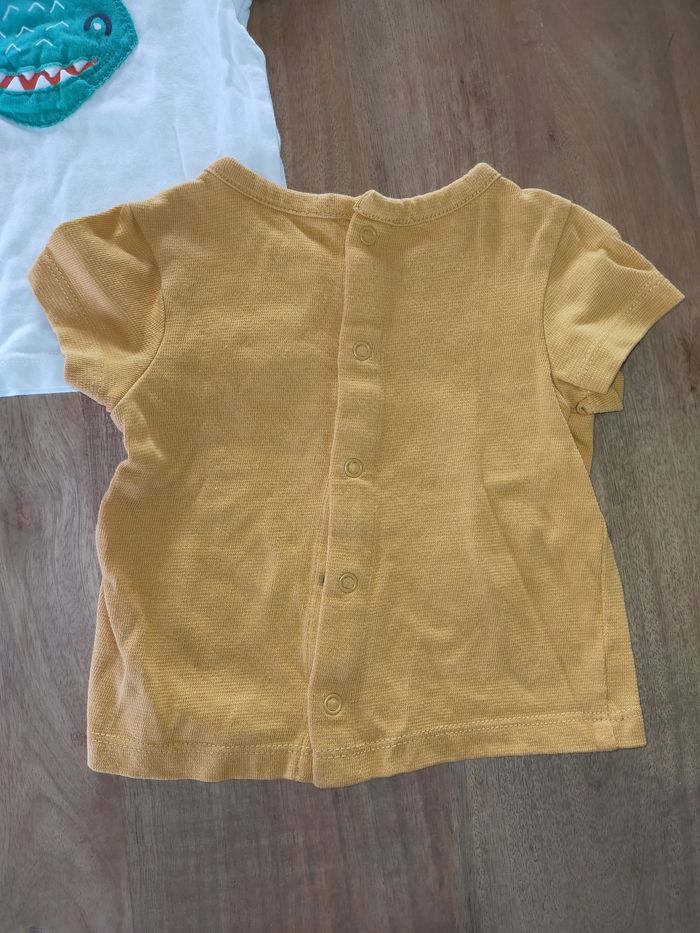 Lot de 2 t-shirts à manches courtes sur le thème des animaux de la jungle (lion 🦁 et crocodile 🐊. Celui de couleur moutarde avec le motif lion se déboutonne entièrement dans le dos, le blanc à motif crocodile se déboutonne à l'encolure. Ils sont très mignons. Ils sont tous les deux de la marque Orchestra, 3 mois 60cm J'ai énormément de choses à vendre, beaucoup ne sont pas encore publiée, n'hésitez pas à demander si vous cherchez quelque chose de spécial 😉 Les remises automatiques sont activées sur mon dressing.