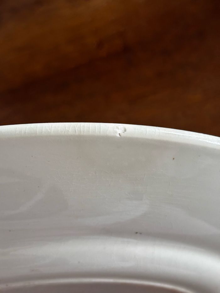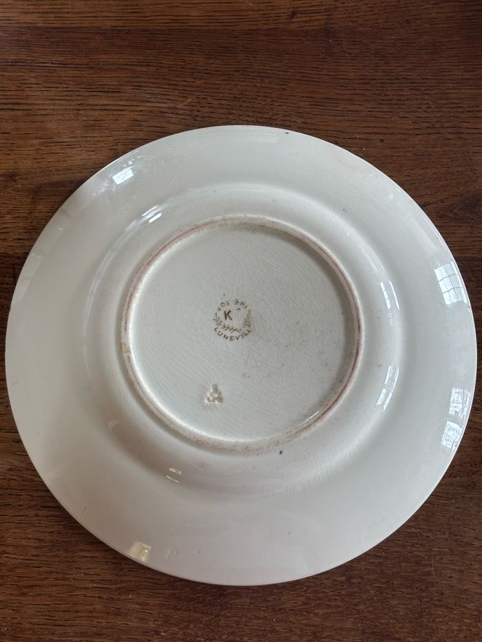 Rare de cette couleur très beau plat de service rond (ou grande assiette) de la manufacture de Luneville Modèle colibri en teinte sépia 26,8 cm de diamètre En bel état pour l’époque pas de gros défauts mais patine du temps (voir photos qui font partie intégrante de la description)